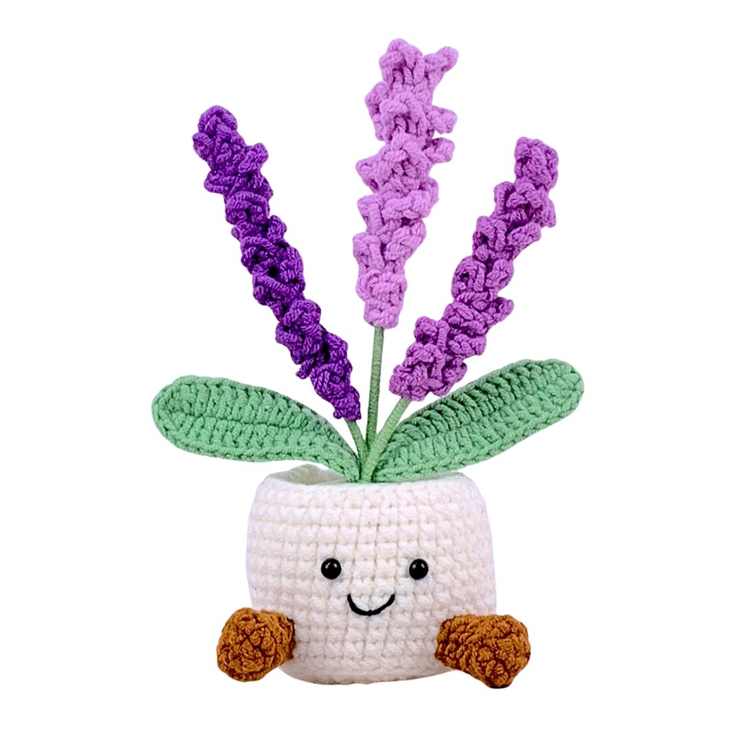 Gehäkelter Blumentopf mit einem lächelnden Gesicht im 'Lavendel-Design'