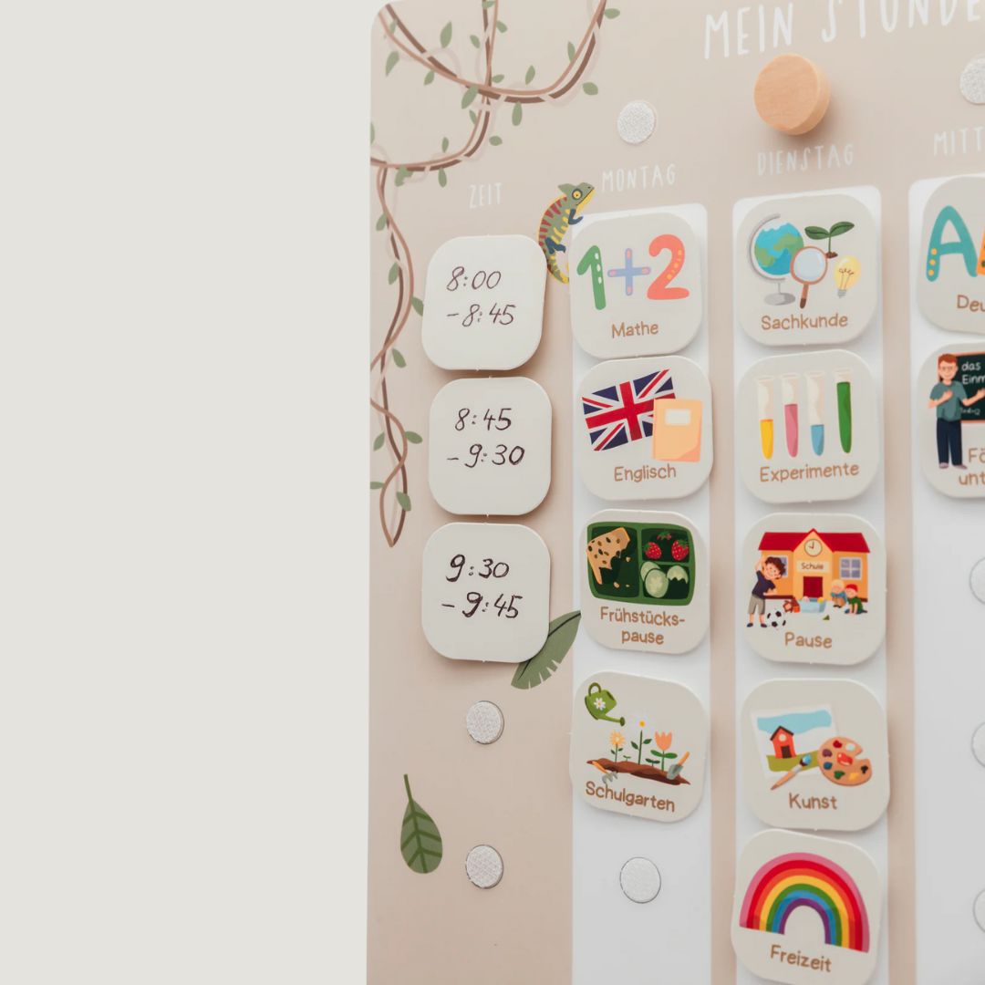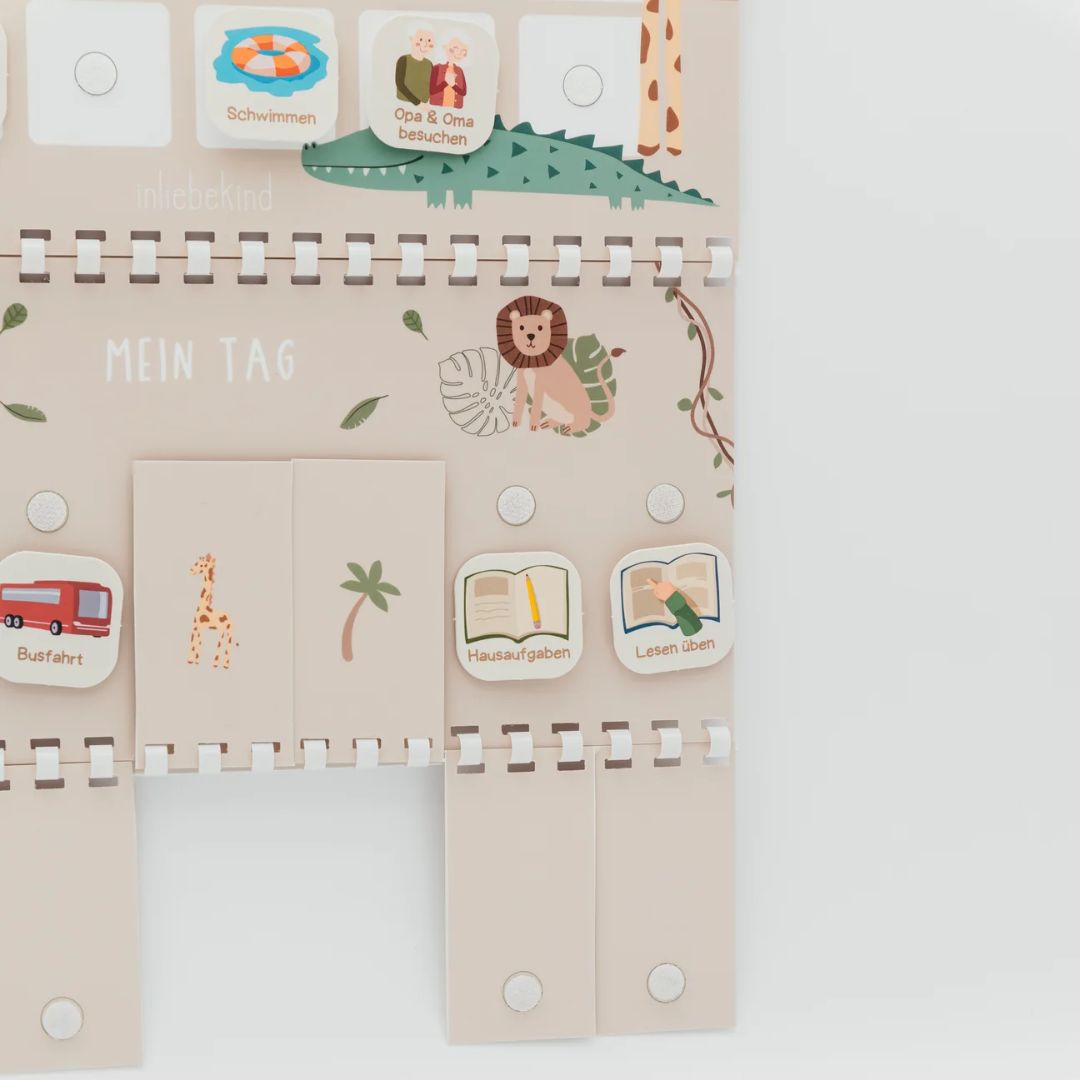 Die visuelle und aktive Gestaltung unterstützt Kinder dabei, Abläufe zu verstehen und selbstständig zu bewältigen. So wird jeder Tag zu einer Safari, auf der dein Kind immer sicherer seinen Weg findet.