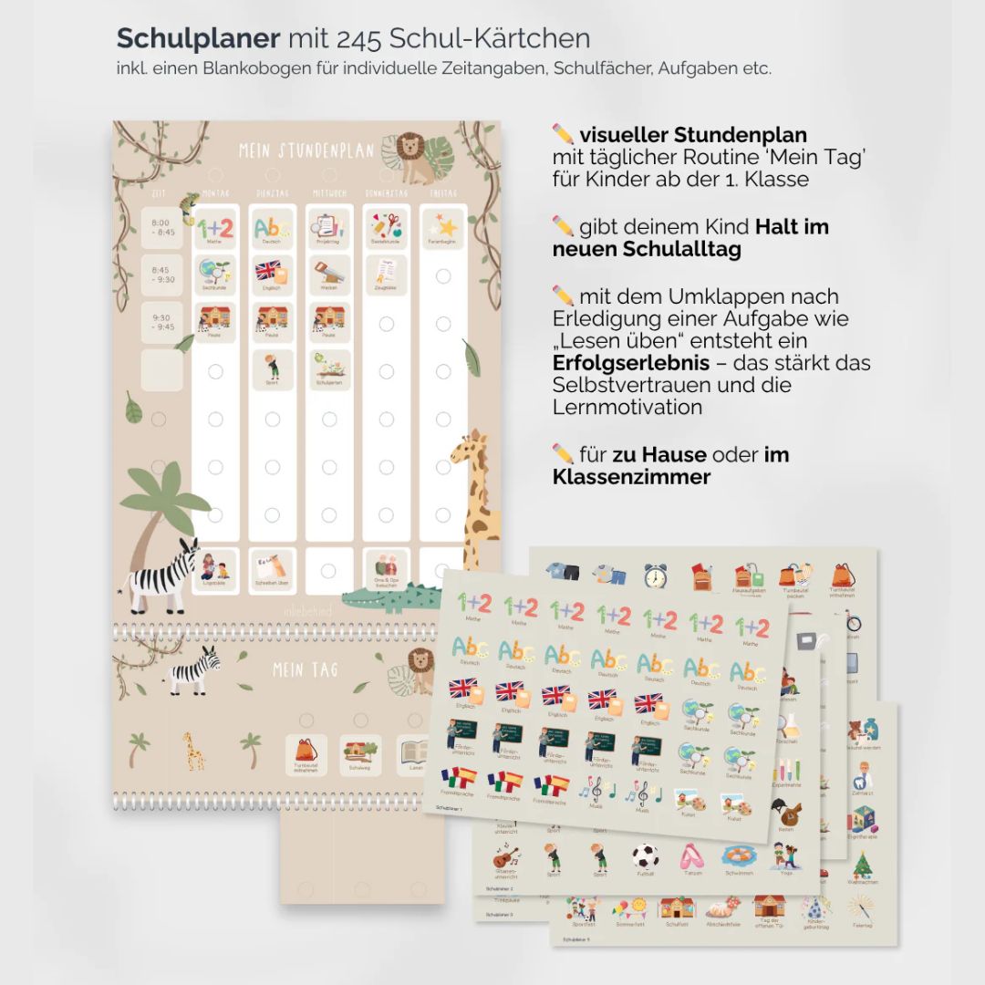 Hol dir den hochwertigen und pädagogisch wertvollen Planer, der dein Kind auf der spannenden Reise durch den Schulalltag begleitet. Mit dem Safari-Motiv wird Struktur zum Abenteuer – und jeder Tag zu einem Erfolgserlebnis.