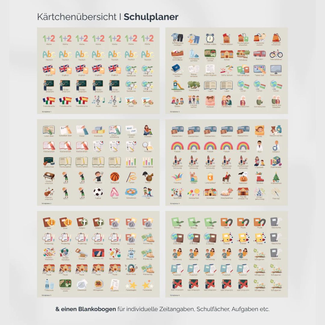 Das Herzstück des Planers sind die 245 mitgelieferten Symbolkärtchen. Jedes Kärtchen ist liebevoll gestaltet und zeigt typische Aktivitäten aus Schule, Freizeit und Alltag – natürlich passend zum Safari-Thema mit kleinen Tieren, Pflanzen und Symbolen, die die Safari-Stimmung unterstreichen.