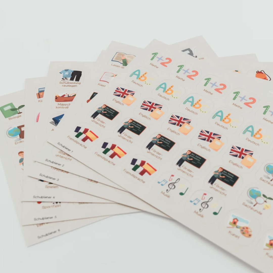 Im Lieferumfang enthalten sind 245 magnetische Symbol-Kärtchen, die typische Aktivitäten aus Schule, Alltag und Freizeit abbilden. Von „Deutsch“ und „Sport“ über „Mittagessen“ bis hin zu „Zähneputzen“ – jedes Kärtchen ist liebevoll illustriert und leicht verständlich, auch für Kinder, die noch nicht lesen können.
