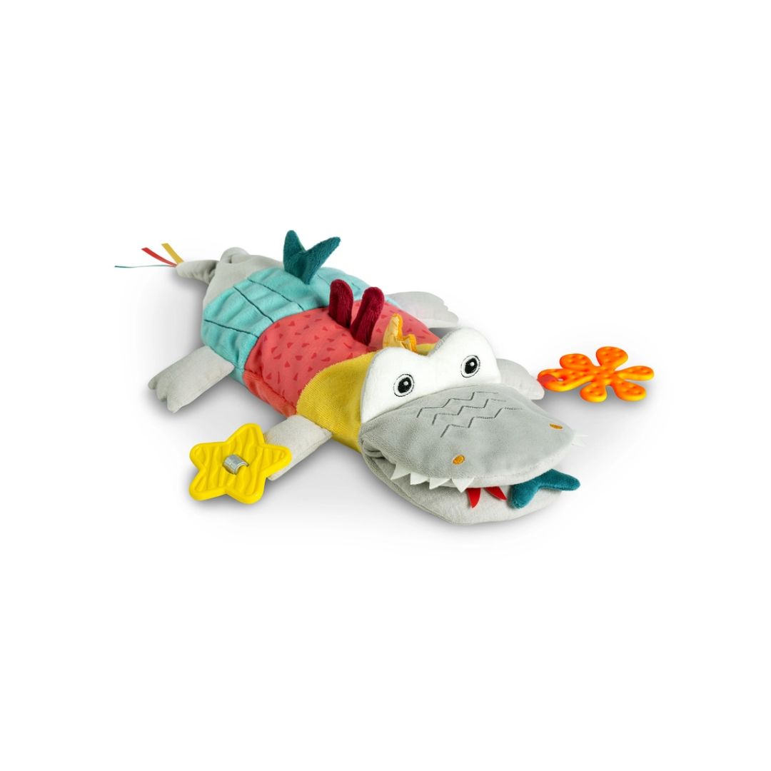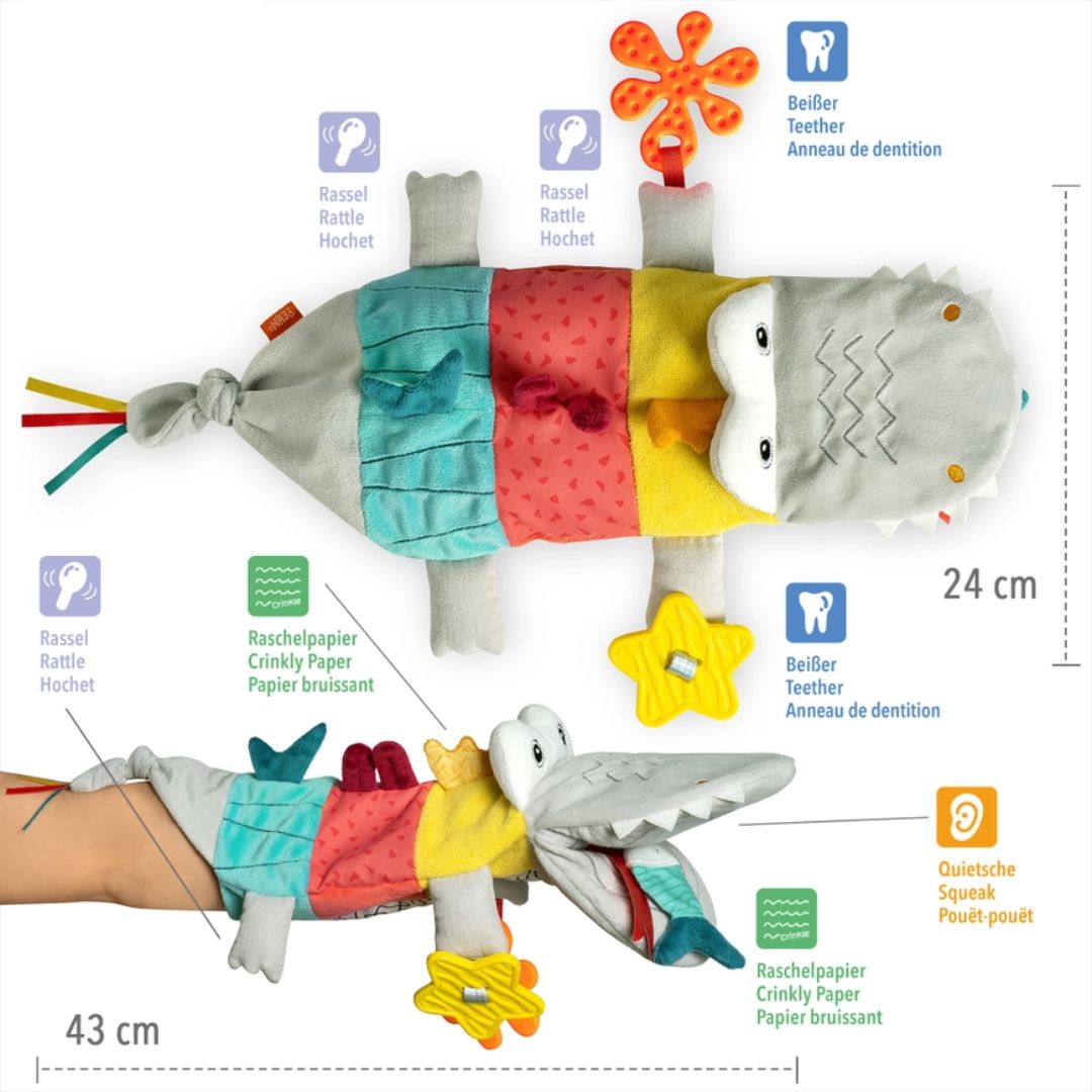 Mit der Handpuppe Krokodil wird jede Spielstunde zu einem sensorischen Erlebnis. Die lustigen Geräusche, die beim Schütteln und Drücken entstehen, machen das Spielen noch spannender: Rasseln und Quietsche sorgen für fröhliche Töne, und das Raschelpapier weckt Babys Neugier und regt zum Greifen und Tasten an. Die bunten Farben und weichen Texturen des Softvelours, Druckstoffs, Frottees und Musselins laden zum Erforschen ein und unterstützen die sensorische Entwicklung deines Babys.
