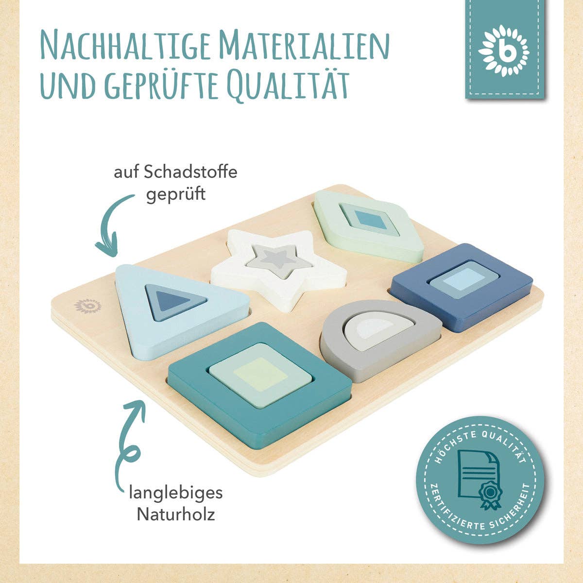 HOLZPUZZLE FORMEN Das geometrische Baby Holzpuzzle von Bieco fördert die Motorik und das Gefühl für Formen und Farben deines kleinen Schatzes spielerisch. Dafür besteht das hochwertig verarbeitete Holzpuzzle aus einer Grundplatte mit verschiedenen Aussparungen und aus 12 Teilen in geometrischen Formen. Nun gilt es, die Puzzleteile richtig zusammenzufügen und in die passenden Formen einzusetzen. Spielerisch werden so Geschicklichkeit und kombinatorischen Fähigkeiten deines Kindes mit dem Formenpuzzle trainiert. Für doppelten Spielspaß können die Holzpuzzle Formen auch als Bausteine genutzt werden. Das dezente Design in hübschen Scandi-Farben macht das pädagogisch wertvolle Lernspielzeug zu einem stylischen Begleiter, der Eltern und Kind begeistert.