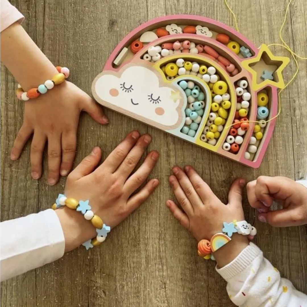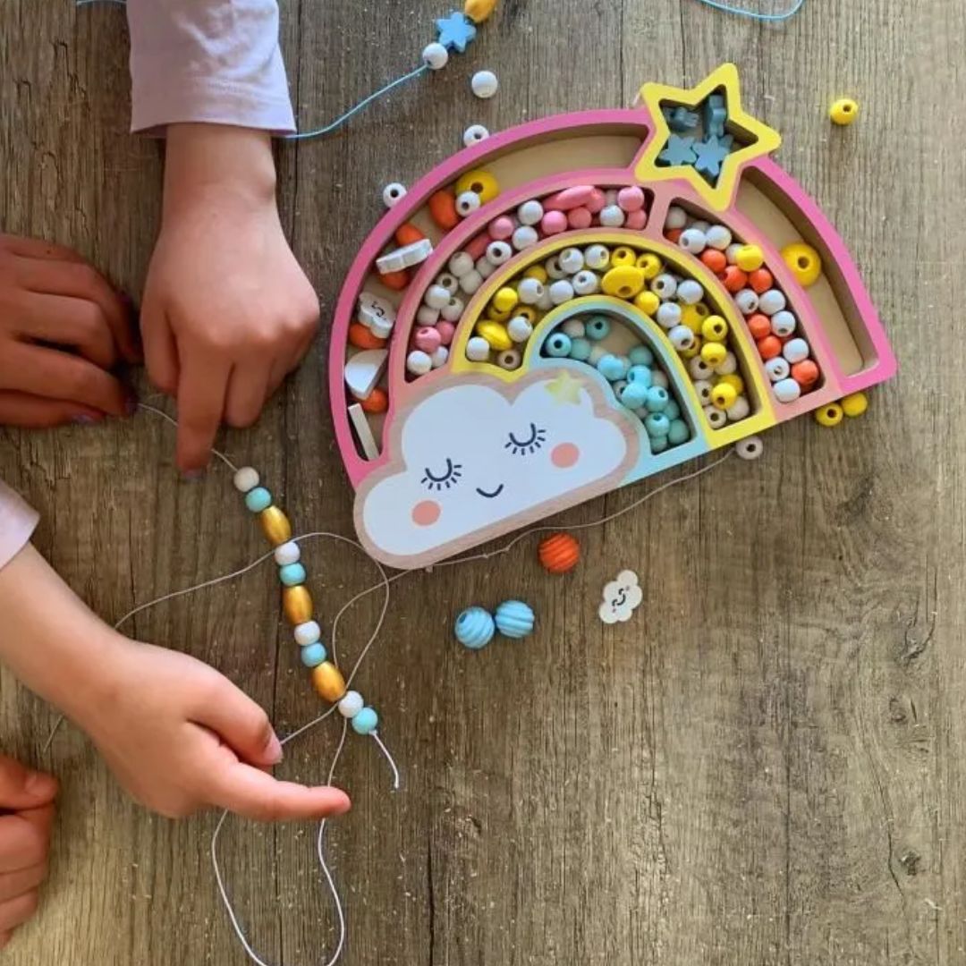 Die pastellfarbenen Holzperlen in einer regenbogenförmigen Schachtel sind ein schönes Geschenk für Kinder ab 3 Jahren. Das Auffädeln der Perlen fördert die Feinmotorik, die Hand-Augen-Koordination und erfordert zudem Geduld und Konzentration.