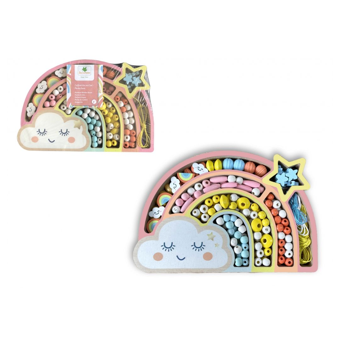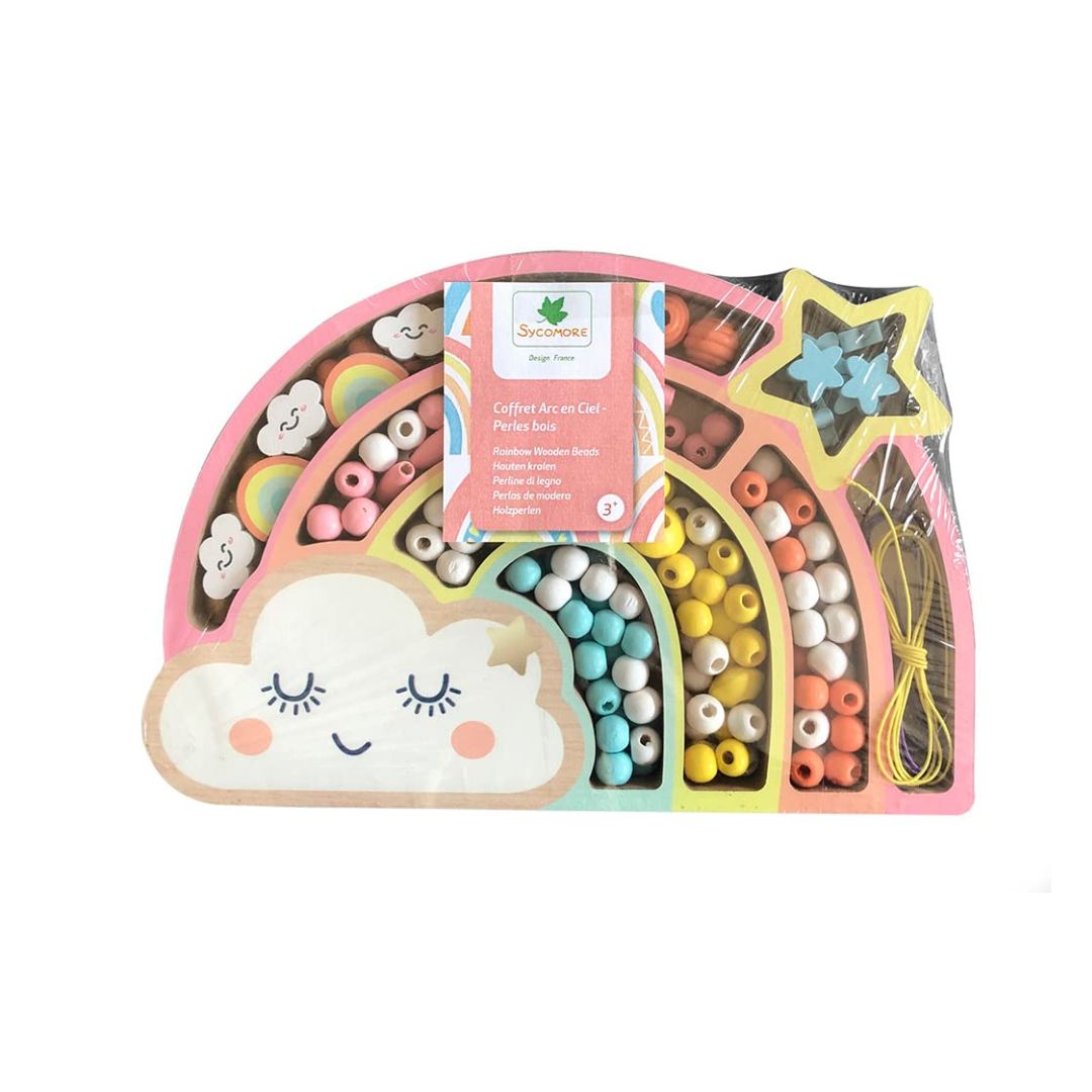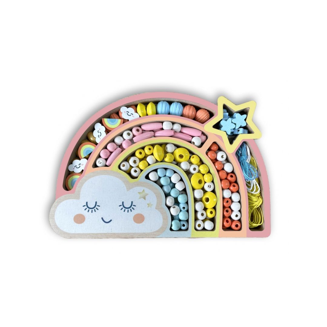In der attraktiven Verpackung findest du mehr als 180 Holzperlen, 2 Anhänger mit Regenbogen und 3 Meter Schnur.