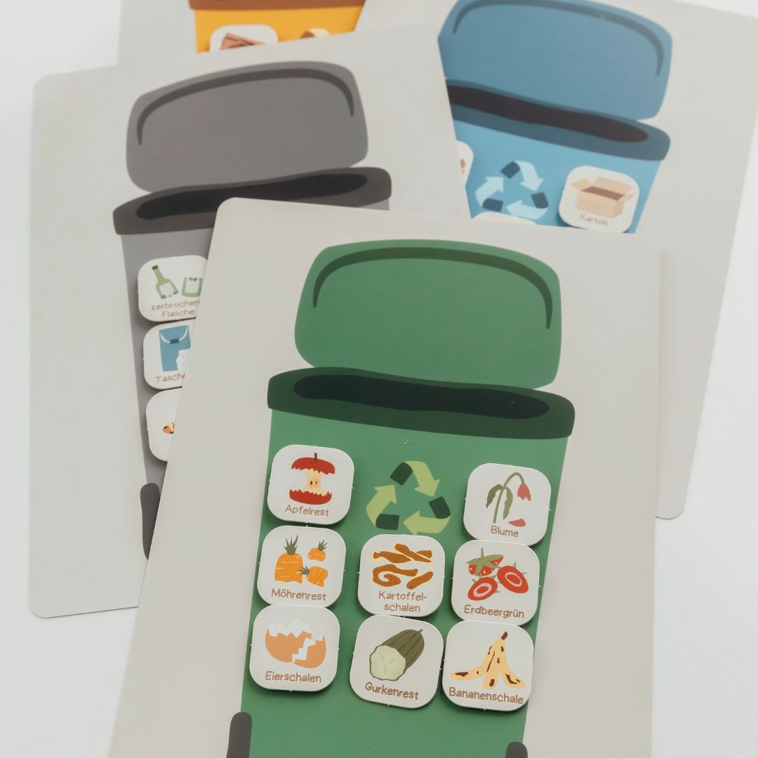 Durch das Zuordnen der richtigen Symbolkärtchen zu den passenden Mülltonnen lernen sie Schritt für Schritt, welche Abfälle in welche Tonne gehören. So entsteht ein spielerischer Lerneffekt, der sich mühelos in den Alltag überträgt – beim Basteln, beim Aufräumen oder beim Entsorgen kleiner Verpackungen zu Hause.