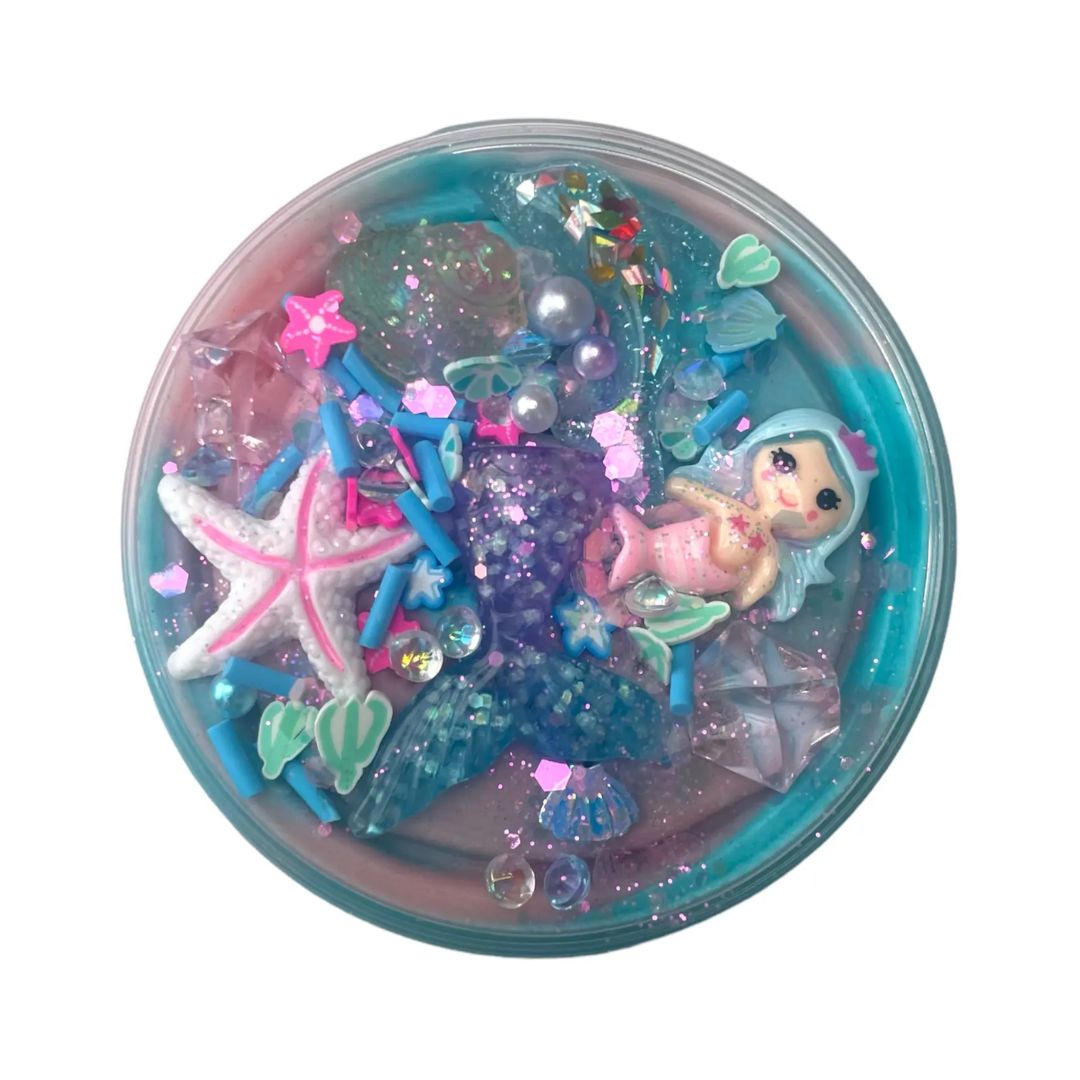 Das Topping besteht aus einer wunderschönen kleinen Meerjungfrau-Figur, ergänzt durch detailreiche Perlen, Muscheln und Seesterne – perfekt, um eine eigene kleine Meeresszene zu erschaffen. Ob du den Strand einer geheimen Insel gestaltest, ein schimmerndes Riff baust oder deine ganz persönliche Fantasiewelt entwickelst: Mit dieser Knete sind deiner Kreativität keine Grenzen gesetzt.