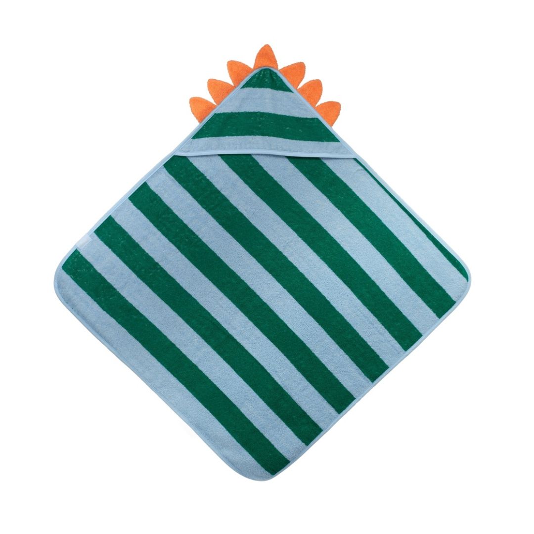 Kapuzenhandtuch aus Baumwolle 75x75 cm Dino Lagoon – gestreift grün/blau mit orangefarbenem Dino-Kamm