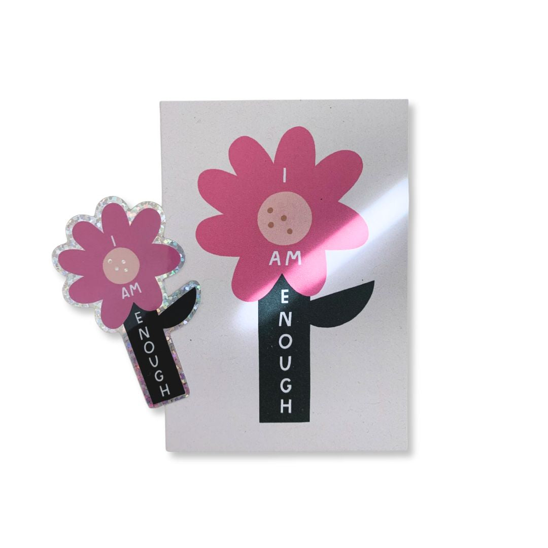 Eine Karte mit der ermutigenden Botschaft 'I am enough' und einem passenden Glitzer Sticker in Form einer Blume, der diese Botschaft weiter trägt.