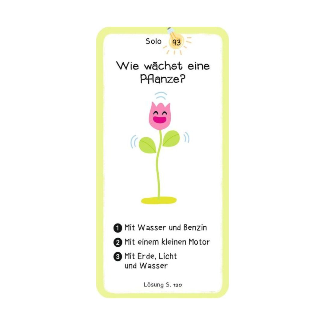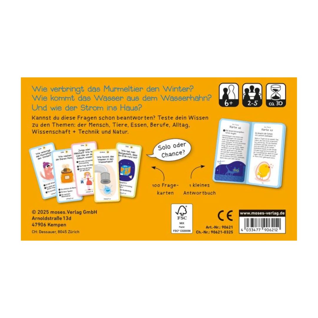 Jede Karte enthält eine Frage aus den Bereichen Mensch, Tier, Technik, Natur oder Alltag