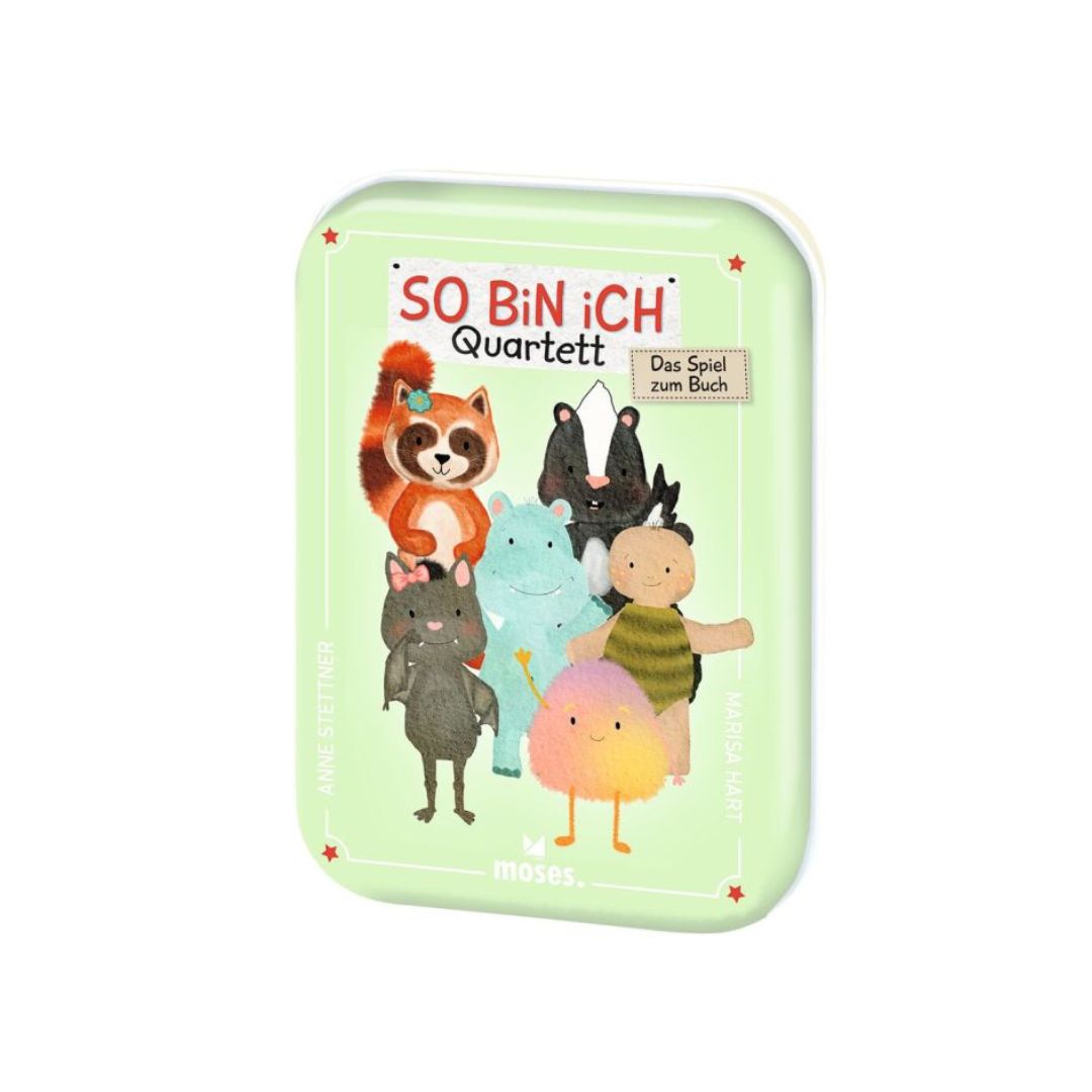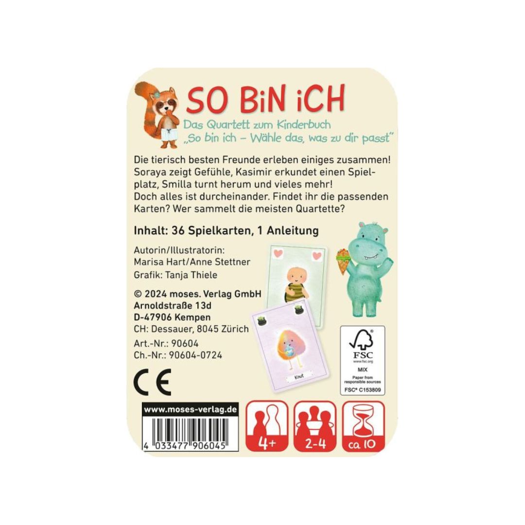 Das Quartett basiert auf dem klassischen und bewährten Kartenspielprinzip, das Generationen von Kindern und Erwachsenen begeistert hat. Es ist besonders einfach gehalten und somit auch für die jüngsten Spieler ab 4 Jahren bestens geeignet. Ziel ist es, vier zusammengehörende Karten einer Familie zu sammeln und so ein Quartett zu bilden. In diesem Spiel warten die bekannten und beliebten Helden aus der Buchreihe darauf, wieder vereint zu werden. Ob Frieda, Soraya oder Valentin – alle Charaktere sind in farbenfrohen und detailreichen Illustrationen dargestellt, die Kinder dazu einladen, in die Welt von „So bin ich“ einzutauchen.