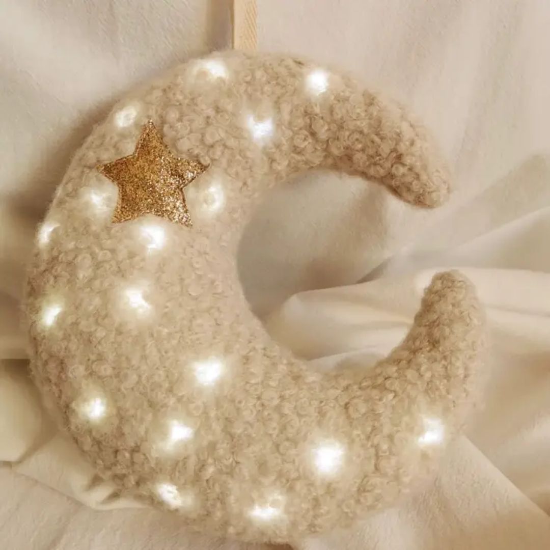 Das Kinder Nachtlicht „Mond“ ist aus hochwertigem Moot-Mout-Stoff gefertigt. Dieser besondere Stoff verleiht dem Mond eine außergewöhnlich angenehme Haptik und sorgt für eine weiche, beruhigende Textur, die zum Träumen einlädt. Kinder lieben die samtige Oberfläche, die nicht nur dekorativ wirkt, sondern auch Geborgenheit vermittelt. Die sanfte Struktur des Stoffs unterstützt eine ruhige Umgebung – perfekt für kleine Träumerinnen und Träumer.