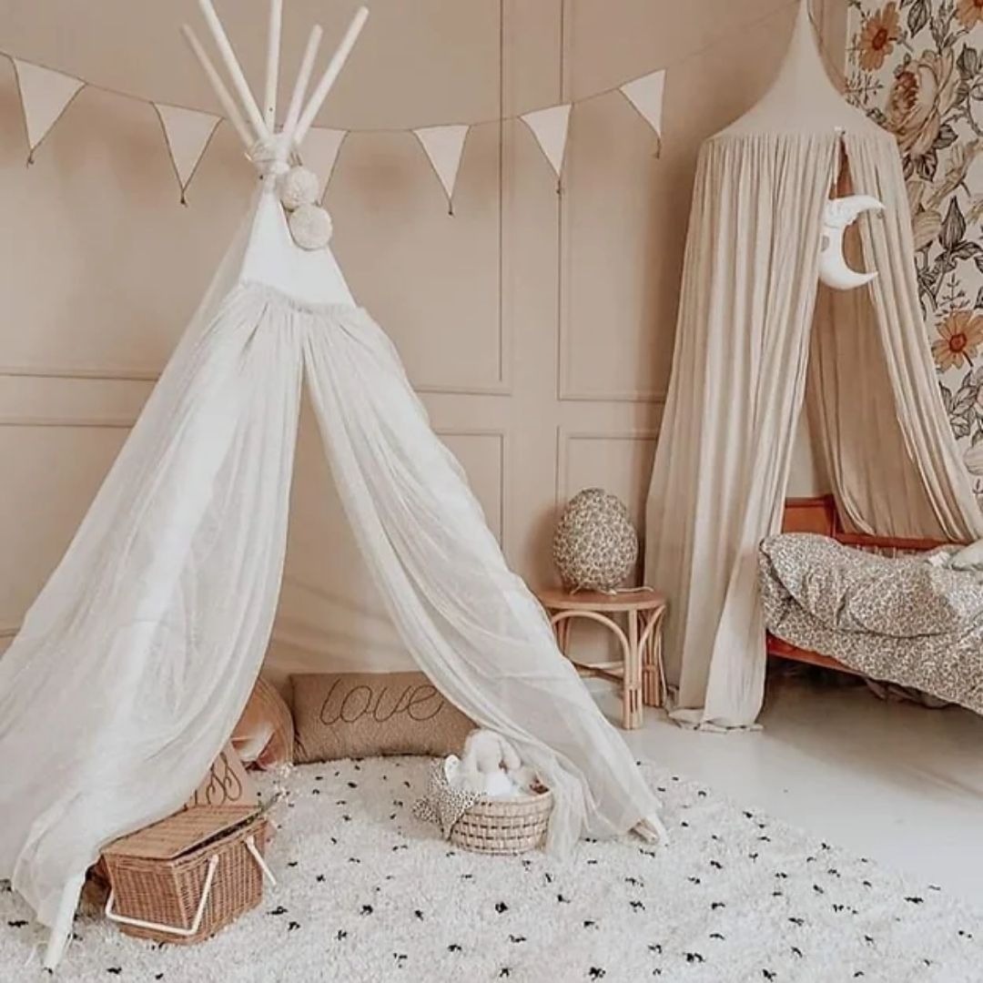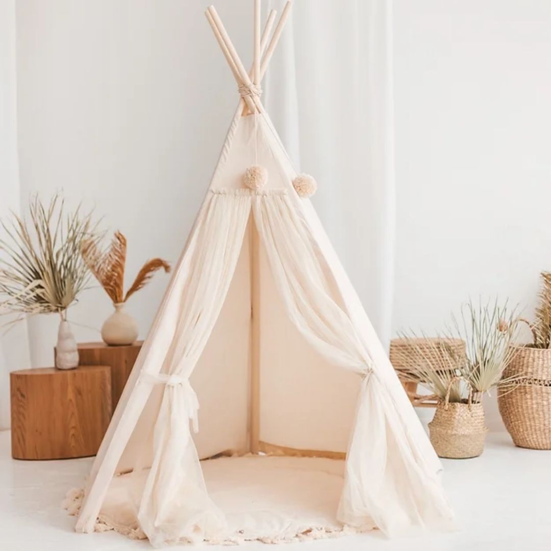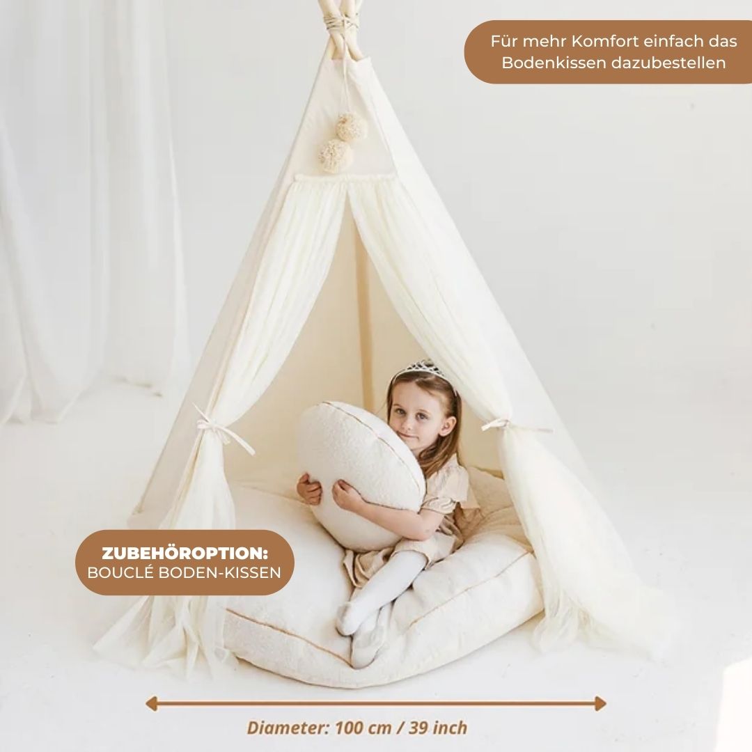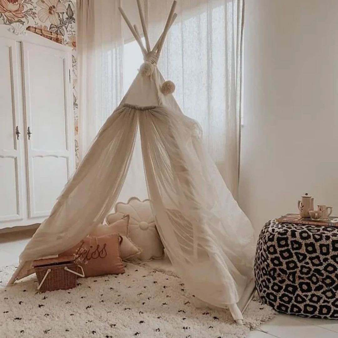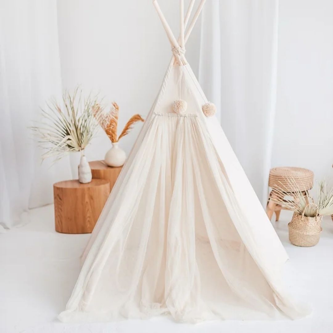 Ein Traum aus Stoff für kleine Prinzessinnen: Das Tipi Zelt mit Tüll in Ecru fürs Kinderzimmer