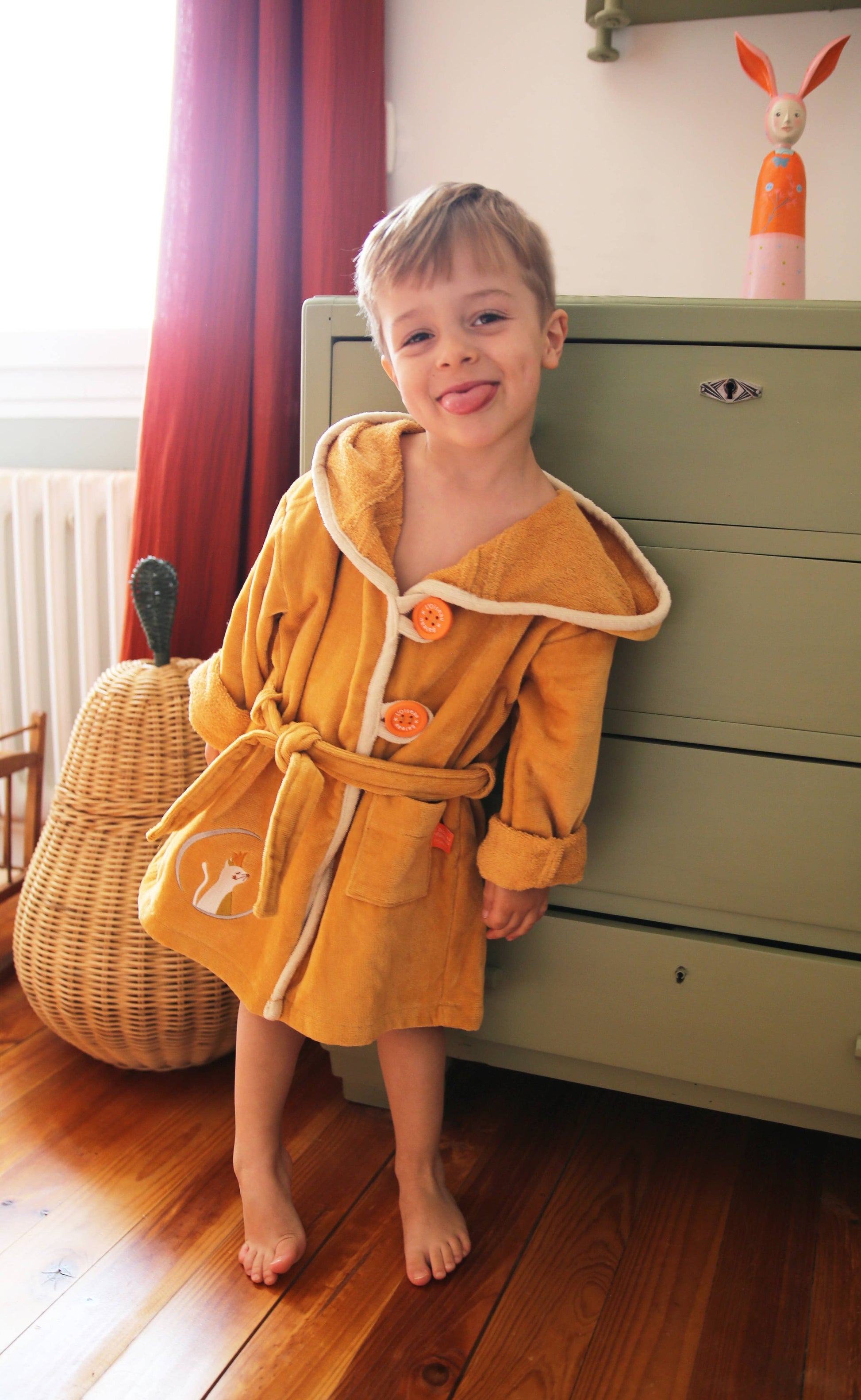 Komfort und Gemütlichkeit: Mit dem bezaubernden Bademantel für Kinder im Alter von 2 bis 6 Jahren. Dieser kuschelige Bademantel in einem farbenfrohen Senfgelb ist mit einem süßen und liebevoll gestalteten Katzenmotiv verziert.