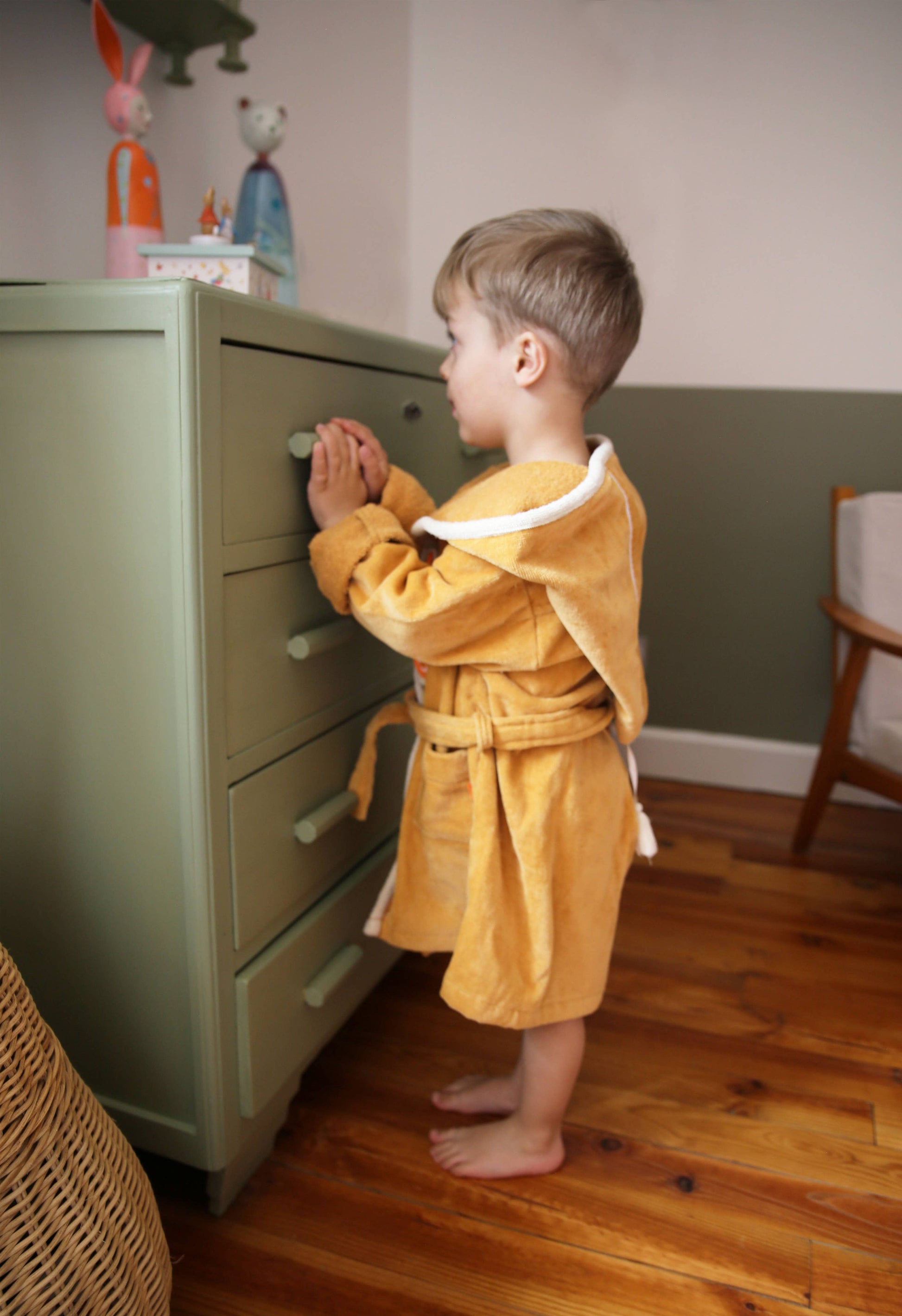 Mit Gürtel, einer Tasche und 2 Gummiknöpfen, die an die kleinen Hände des Kindes angepasst sind. Ein einfacher Abschluss zur Stärkung der Autonomie des Kindes! Ideal am Ende des Bades, auch ideal am Ende des Pools und perfekt für den Strand!