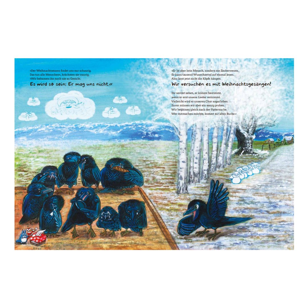 Das hat er einst von den Menschen erfahren, als er ihnen beim Plätzschen backen zugeschaut hat. Doch er erntet nur Spott als er den anderen Raben davon erzählt, denn keiner von ihnen hat den Weihnachtsmann je gesehen. Und so kommt es, dass niemand zur ersten Übungsstunde des Rabenchors erscheint.