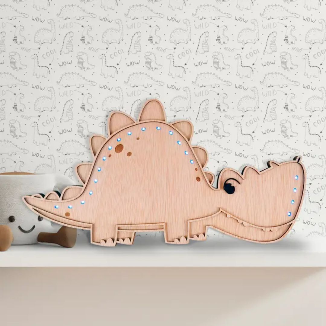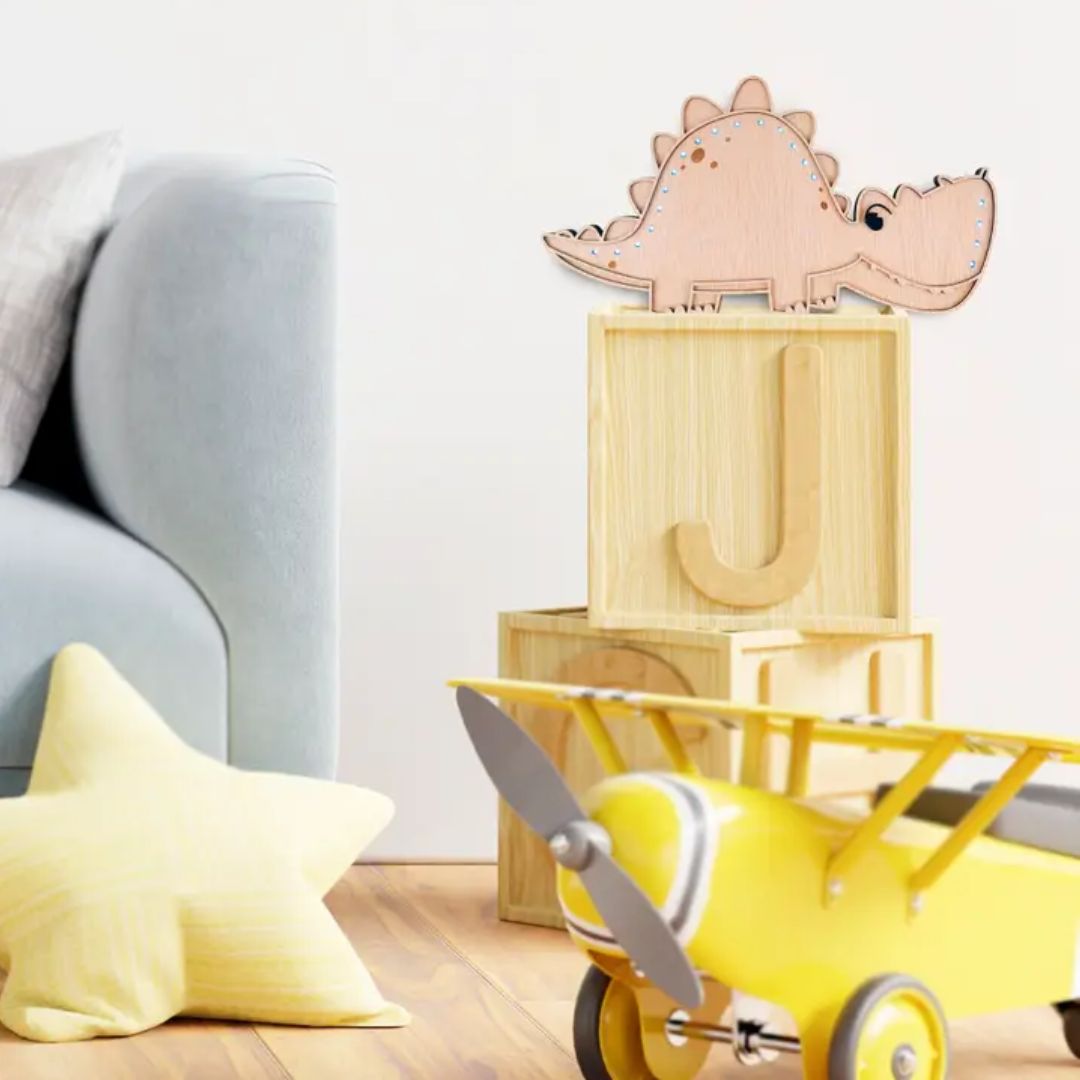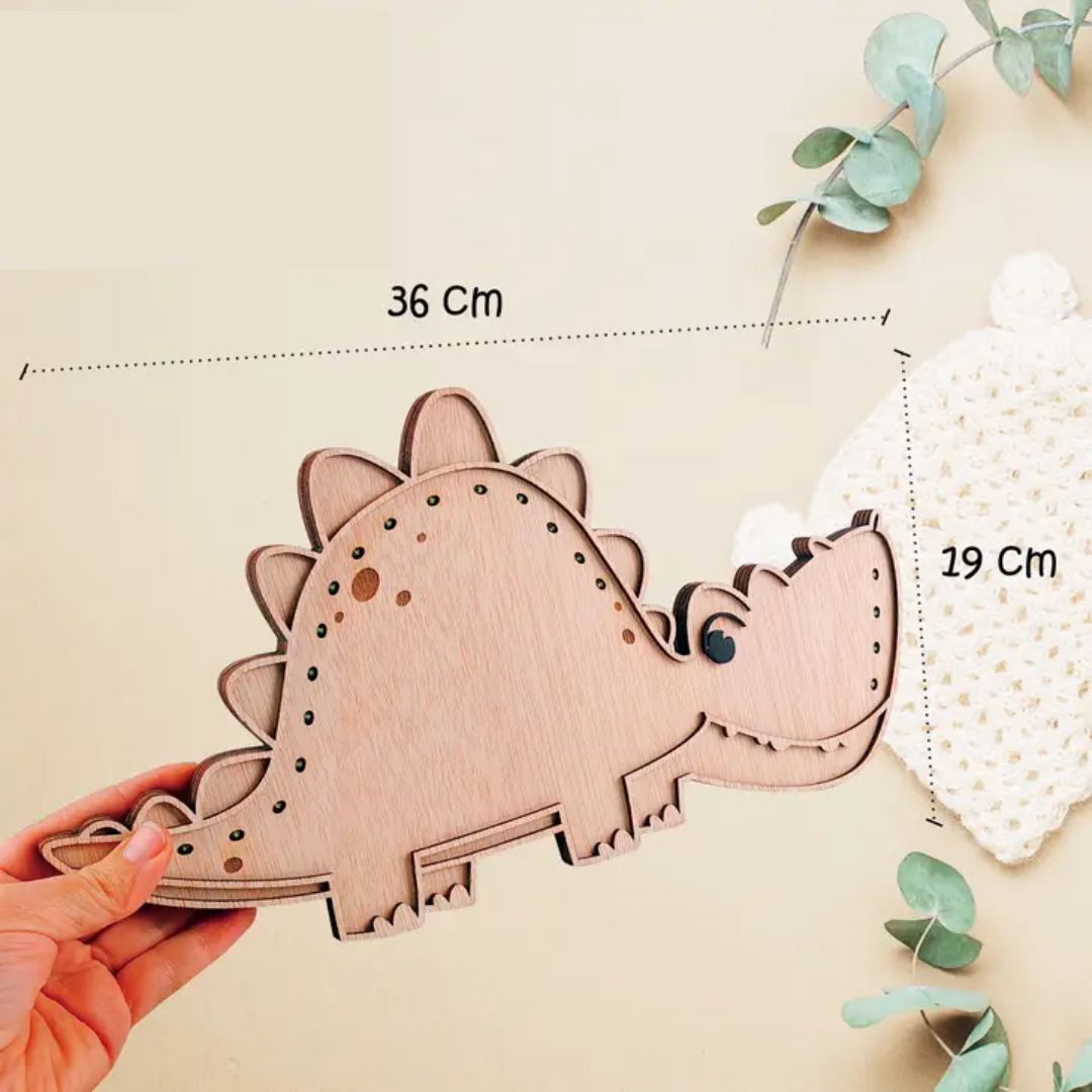 Willkommen in unserer magischen Welt der Kinderlampen! Unser niedlicher Dino steht bereit, um das Kinderzimmer zu erhellen und die Fantasie zum Leuchten zu bringen. Diese Kinderlampe aus Holz ist einfach zum Aufhängen an der Wand oder perfekt für den Nachttisch geeignet. Mit den batteriebetriebenen LED-Leuchten ist sie sowohl als normale Beleuchtung als auch als beruhigendes Nachtlicht für Deinen kleinen Träumer ideal. Aber diese Lampe ist mehr als nur ein Lichtspender - sie ist ein wahrer Freund für Deine Kinder. Unser liebenswerter Dino wird zum Hüter ihrer Träume und sorgt für eine gemütliche und sichere Atmosphäre im Kinderzimmer kleiner Süßlinge. Mit seinem bezaubernden Dinosaurier-Design ohne Kabel wird er zum Blickfang und lässt Kinderaugen strahlen.