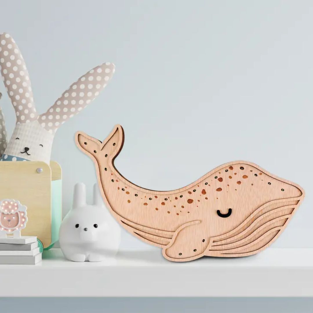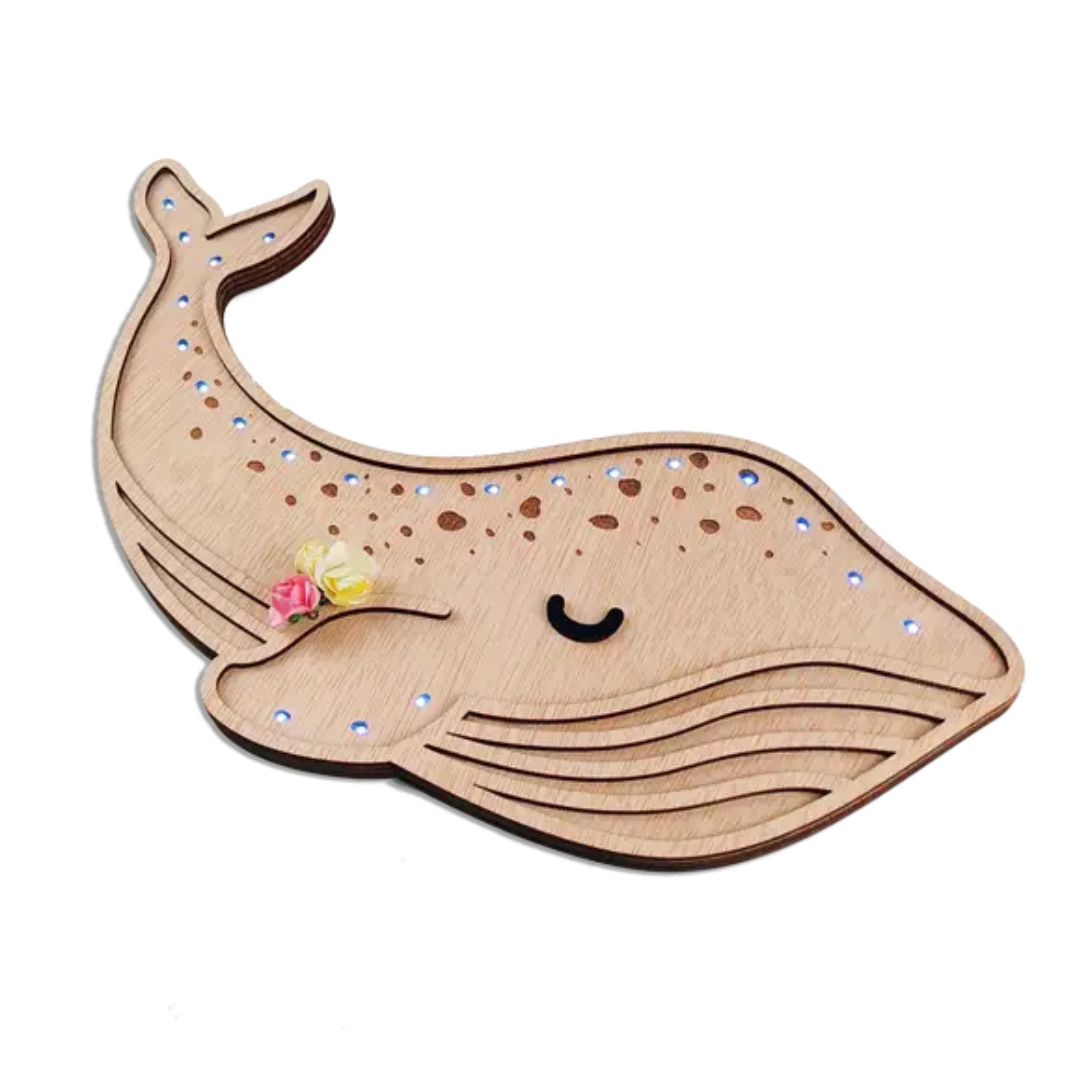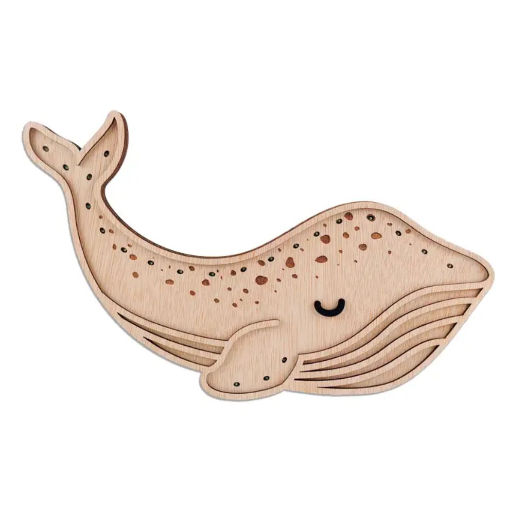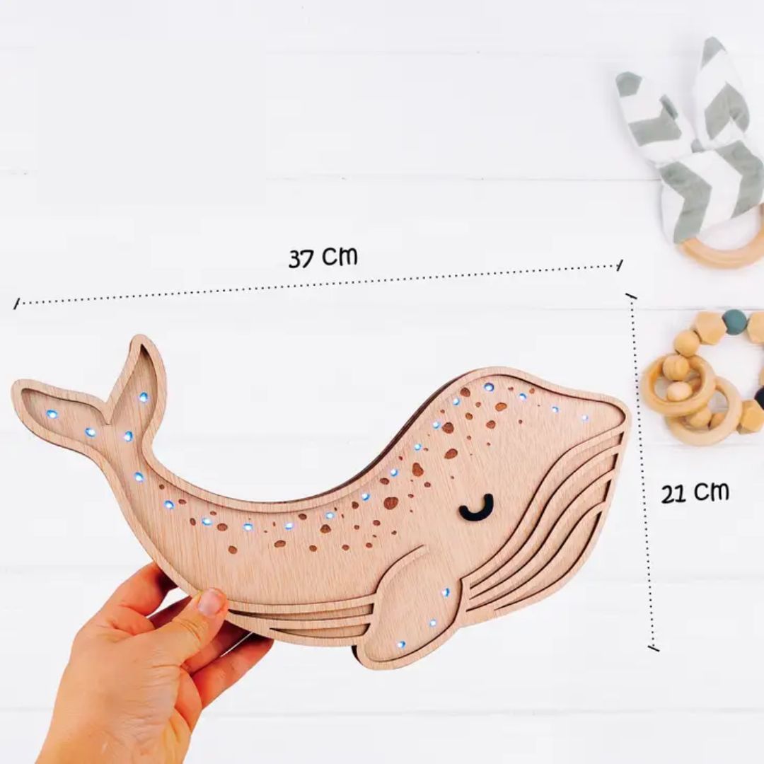 Unser niedlicher Wal steht bereit, um das Kinderzimmer in ein sanftes Licht zu tauchen und die Fantasie zum Strahlen zu bringen. Diese Kinderlampe aus Holz ist perfekt zum Aufhängen an der Wand oder für den Nachttisch geeignet. Mit den batteriebetriebenen LED-Leuchten sorgt sie sowohl für eine angenehme Beleuchtung als auch als beruhigendes Nachtlicht für kleine Träumer.