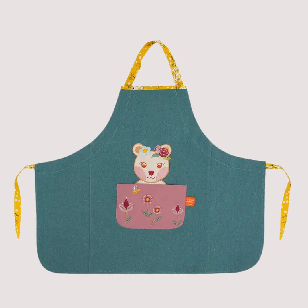 Kinderschürze Madame Bär in Farbe petrol personalisierbar