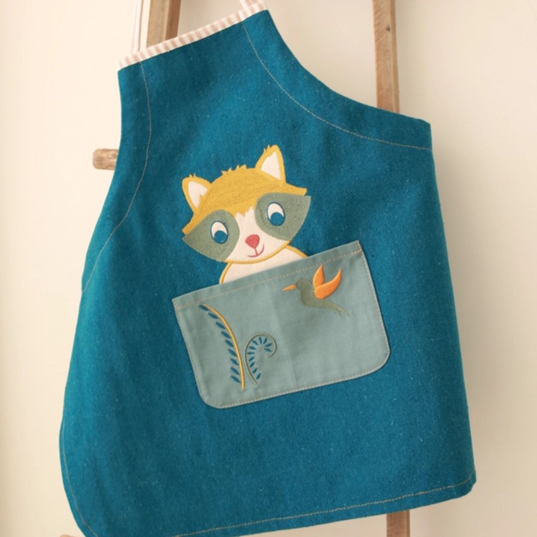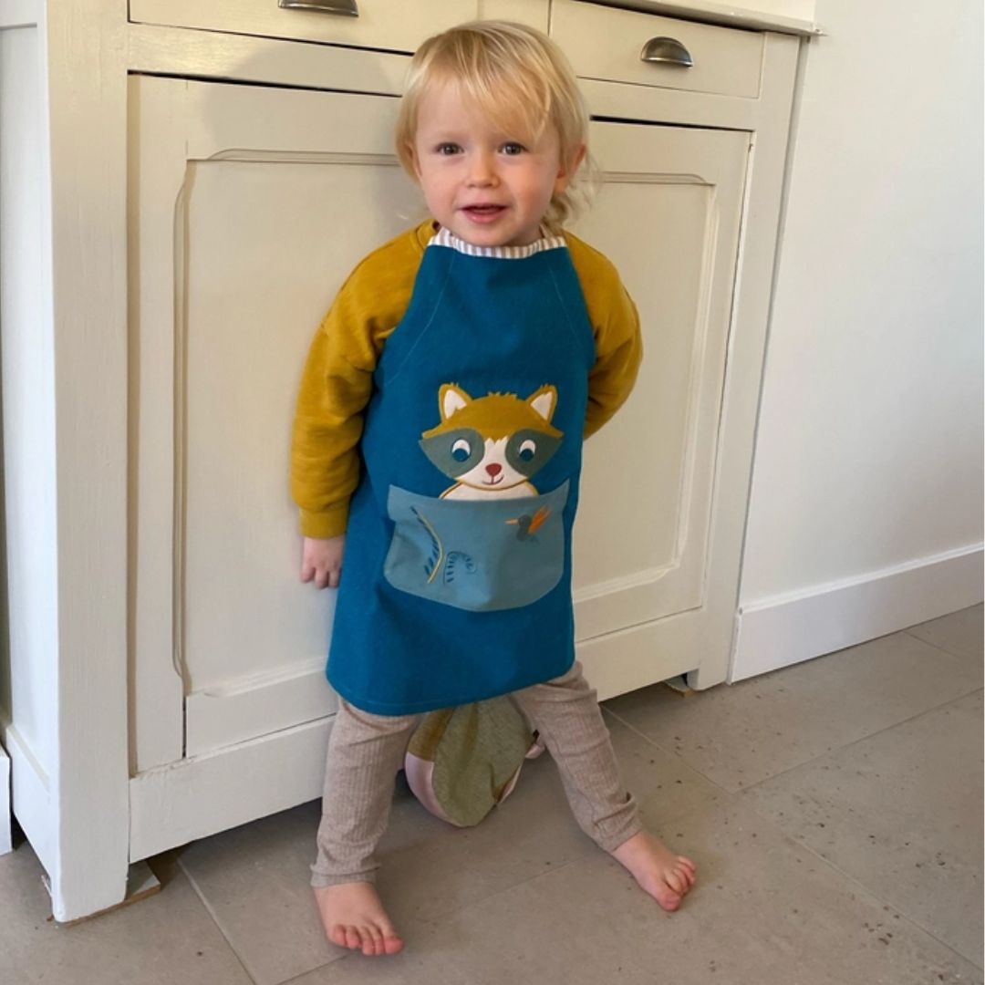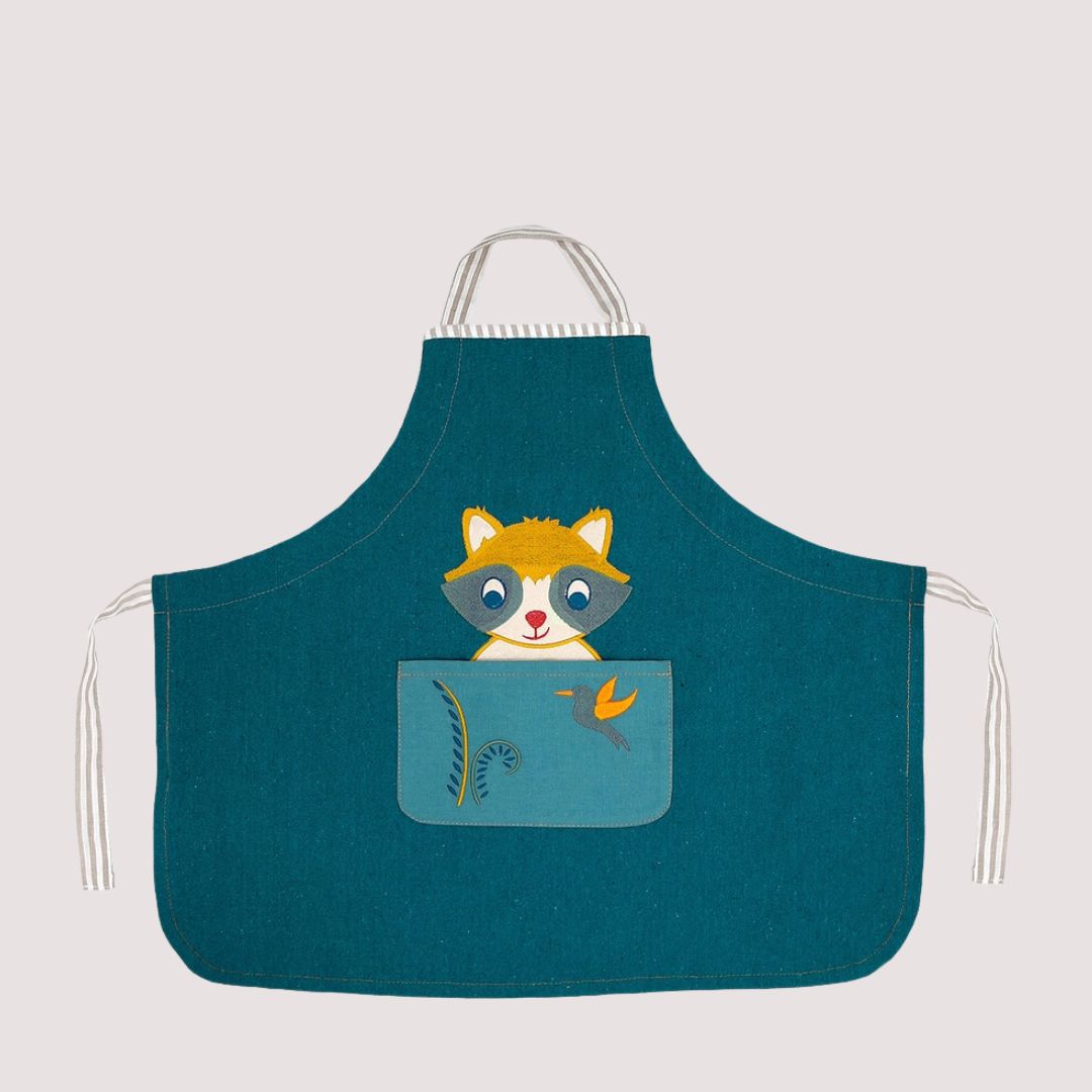 Kinderschürze Waschbär in Farbe petrol personalisierbar