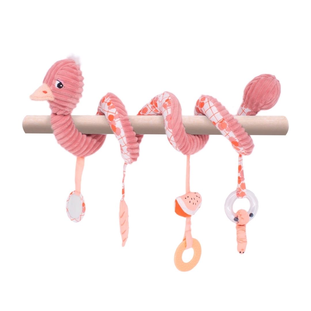 Ein witziges Spiral Spielzeug mit vielen Geräusch- und Tastaktivitäten: Rassel, Knisterpapier, Quietscher, Spiegel, Beißring.