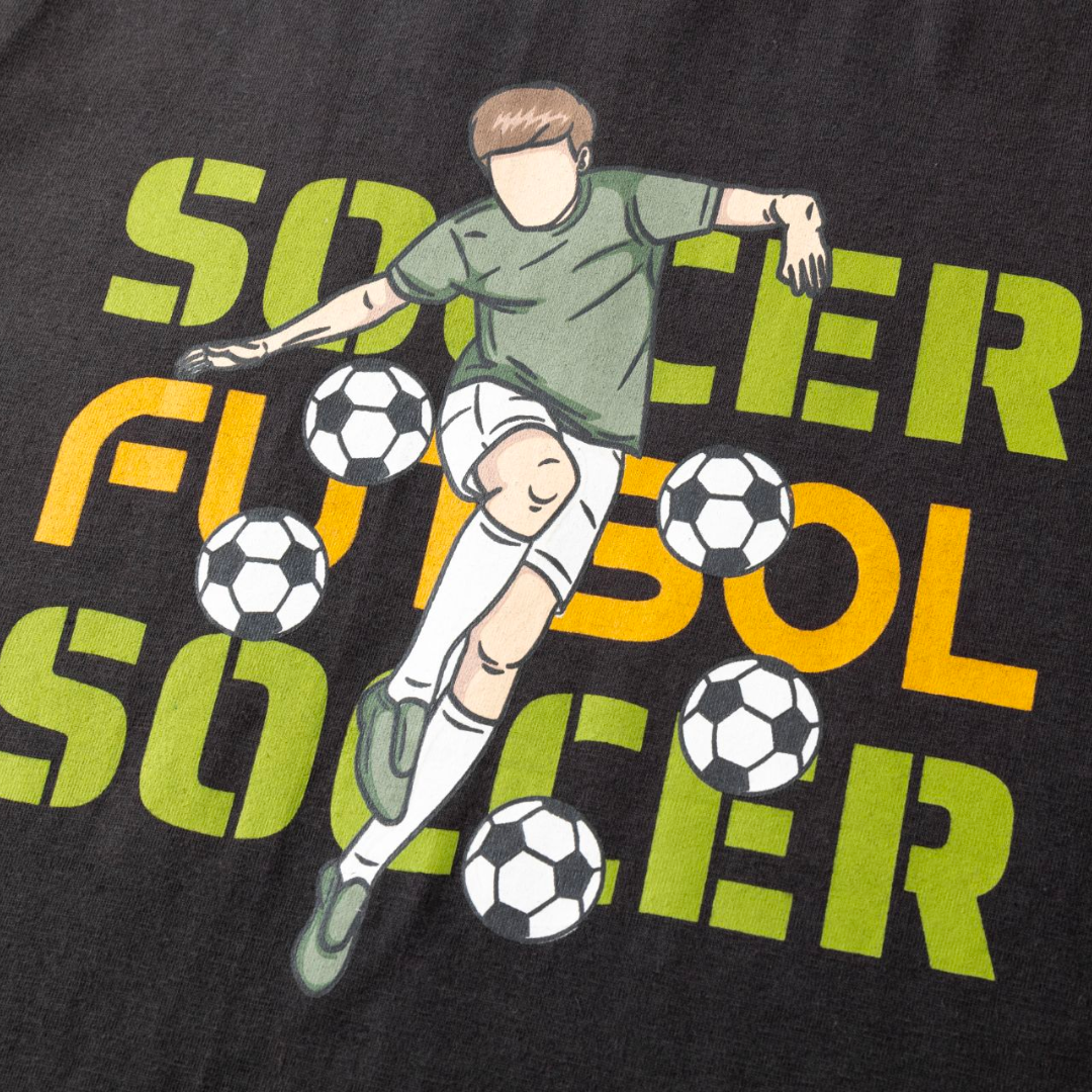 T-Shirt aus Single-Jersey mit geripptem Halsausschnitt und Aufdruck auf der Vorderseite, Farbe dunkelgrau, weich und bequem, hergestellt aus hochwertigen Materialien, Thema: Fußball, Soccer