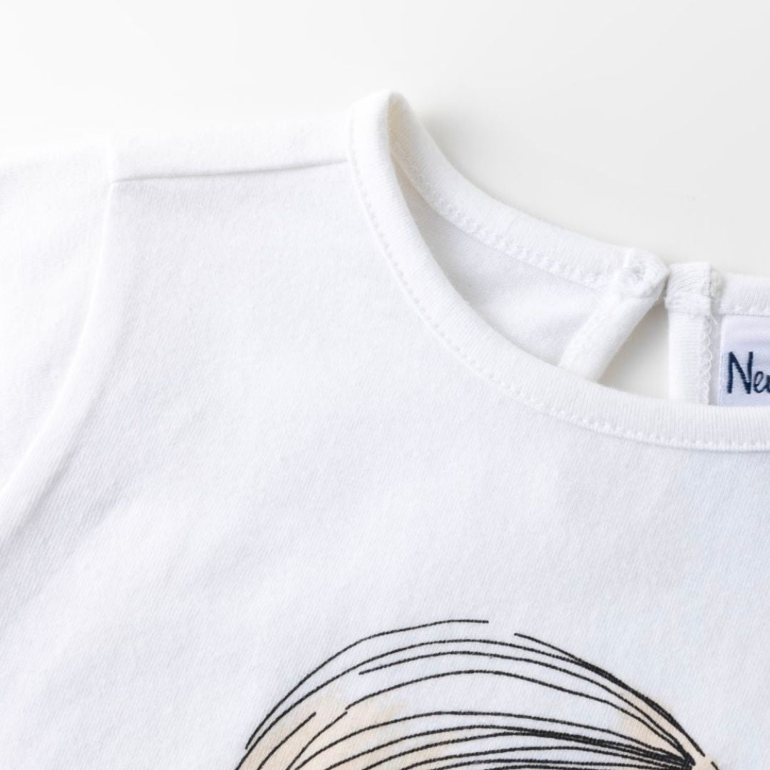 T-Shirt aus elastischem Single-Jersey mit wasserbasiertem Druck und Fransendetail auf der Vorderseite. Öffnung mit Knopfverschluss auf der Rückseite, Farbe weiß, weich und bequem, hergestellt aus hochwertigen Materialien