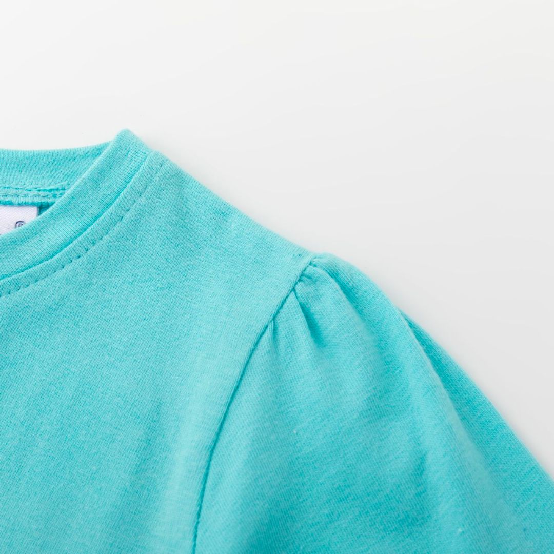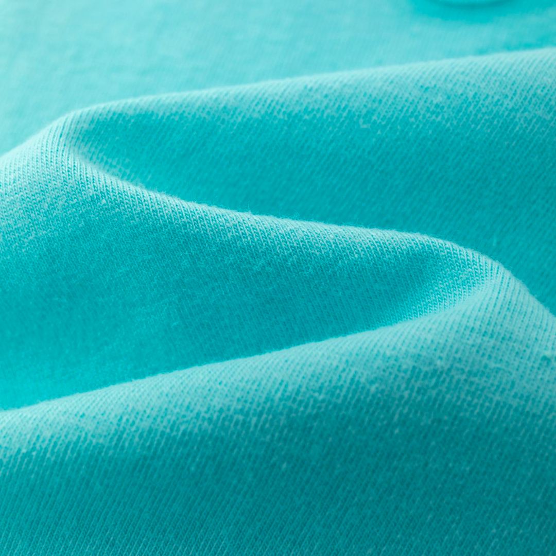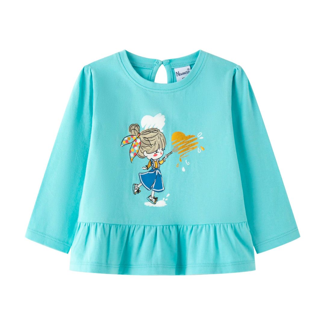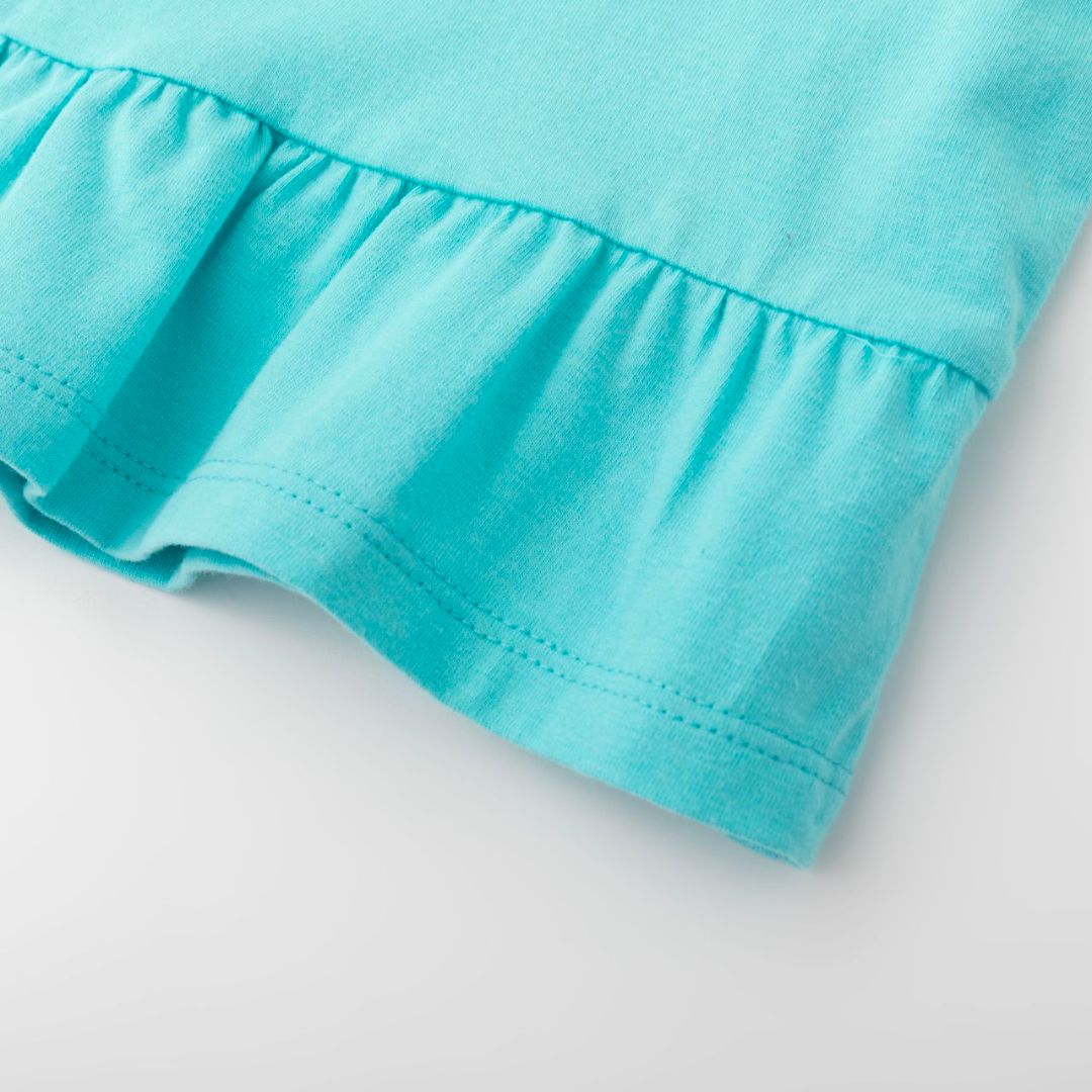 T-Shirt aus Stretch-Single-Jersey mit wasserbasiertem Druck und Folientechnik auf der Vorderseite, mit Rüschendetail, Öffnung mit Knopfverschluss auf der Rückseite, Farbe türkis, vielseitig kombinierbar, weich und bequem, hergestellt aus hochwertigen Materialien