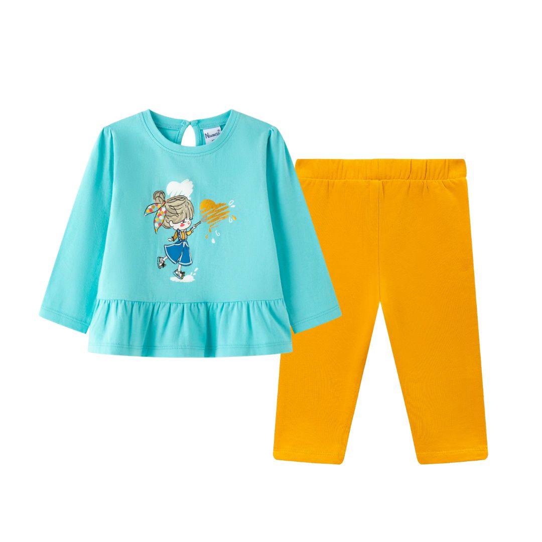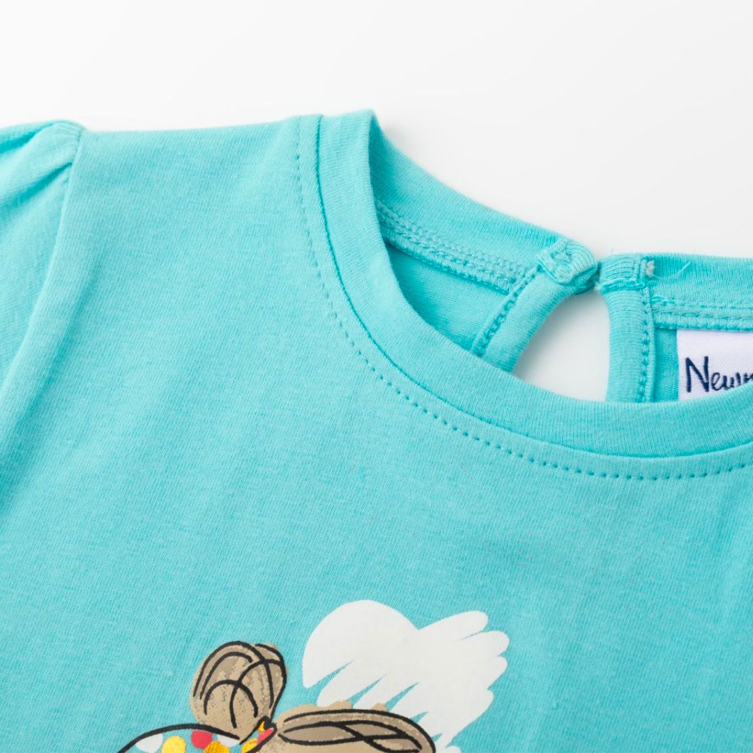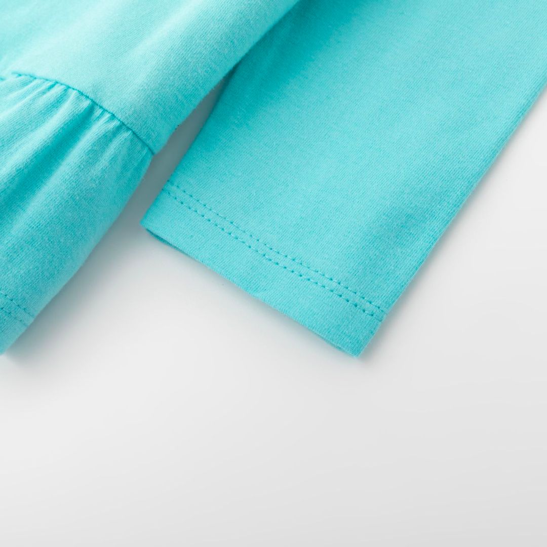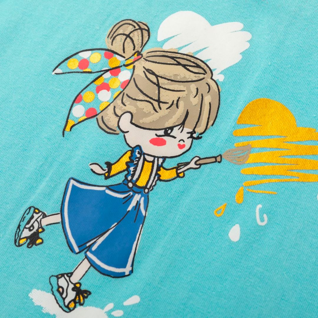 T-Shirt aus Stretch-Single-Jersey mit wasserbasiertem Druck und Folientechnik auf der Vorderseite, mit Rüschendetail, Öffnung mit Knopfverschluss auf der Rückseite, Farbe türkis, vielseitig kombinierbar, weich und bequem, hergestellt aus hochwertigen Materialien