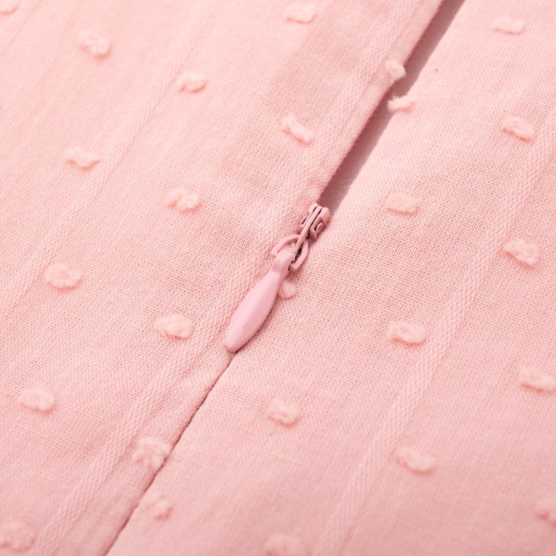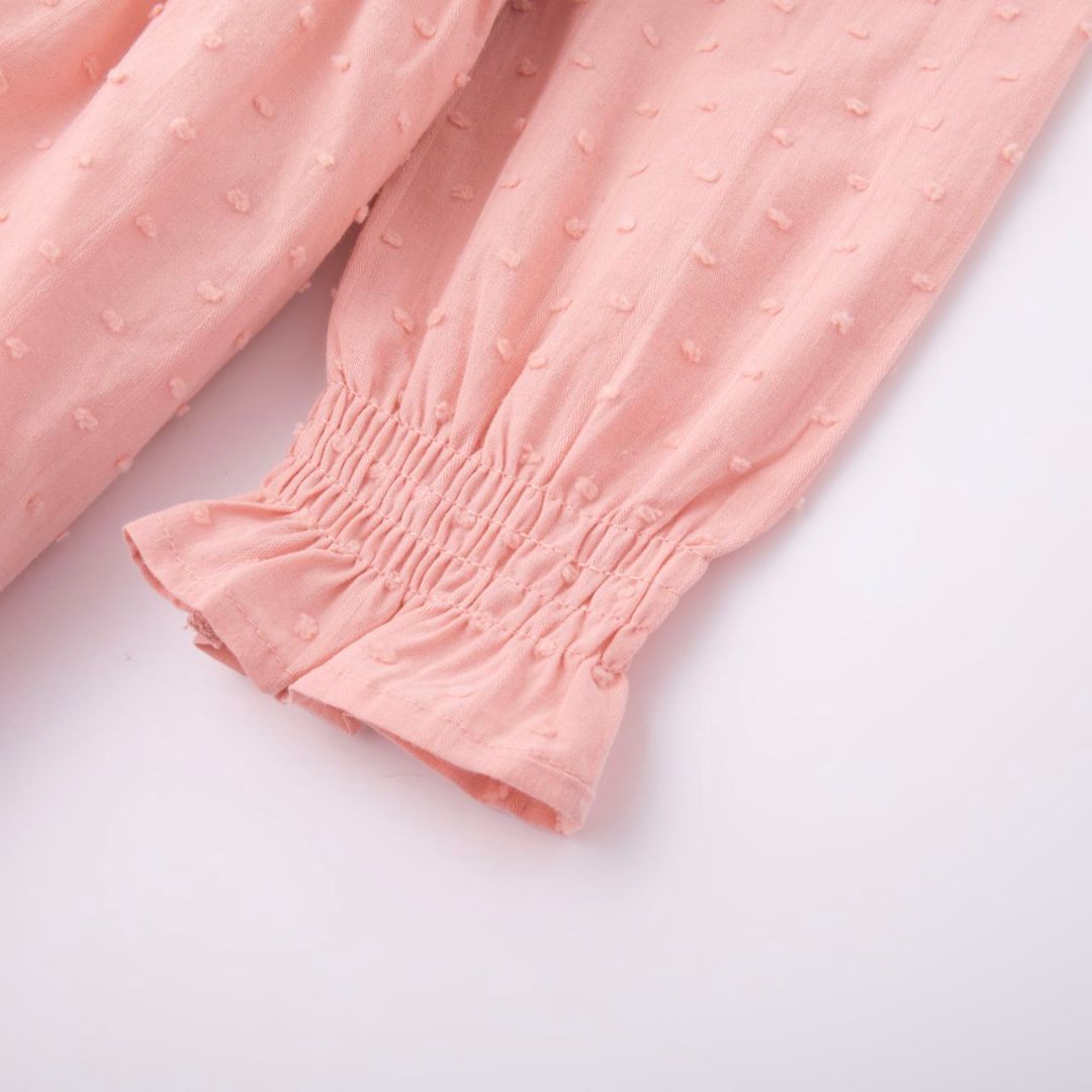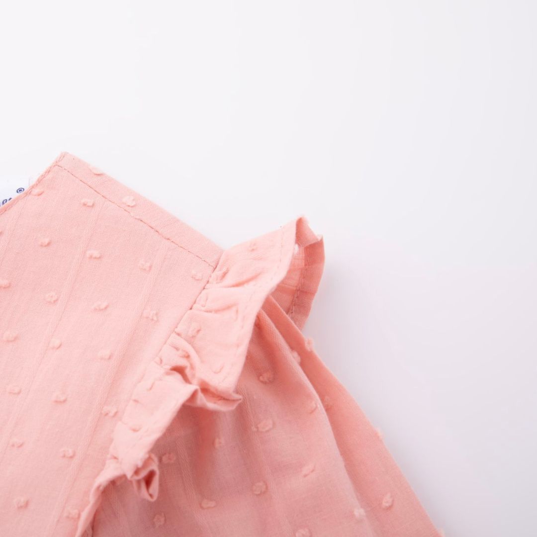 Kleid aus Popeline im Plumeti-Stil, tailliert geschnitten, mit einer kleinen Rüsche aus demselben Stoff. Ärmel mit elastischen Bündchen und Rüschen