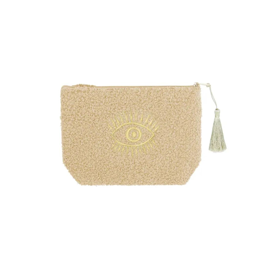 Du suchst eine edle, aber zugleich kuschelige Make-up Tasche, die deine Beauty-Essentials sicher verstaut? Diese modische Make-up Tasche aus weichem Teddyplüsch in Beige ist nicht nur praktisch, sondern auch ein echtes Design-Highlight. Die goldene Augen-Stickerei verleiht ihr einen Hauch von Eleganz und macht sie zum stilvollen Hingucker.