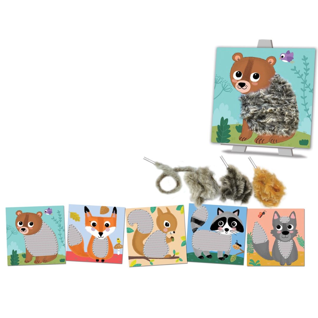• 5 dicke Pappkarten (18 x 18 cm) mit den Motiven eines Bären, eines Fuchses, eines Eichhörnchens, eines Waschbären und eines Wolfs