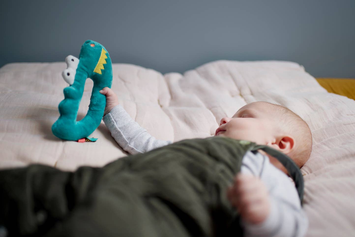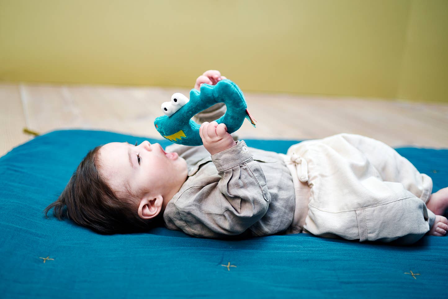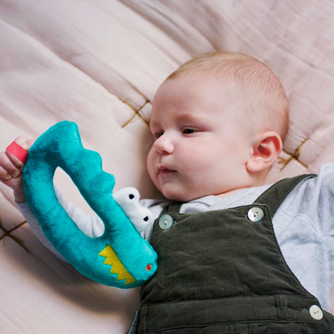 Wenn dein Baby diese niedliche Krokodilrassel schüttelt, wird es von den sanften Rasselgeräuschen verzaubert. Die angenehmen Klänge, die es erzeugt, sind wie eine Melodie für kleine Ohren und wecken die Freude an den ersten eigenen Bewegungen. Keine Sorge – dieses kuschelige Krokodil beißt nicht! Es ist speziell für die zarte Babyhaut und die Erkundungsreisen kleiner Finger gemacht. Die liebevolle Gestaltung und die kontrastreichen Farben machen dieses Krokodil zu einem perfekten Begleiter für die sensorische Entwicklung deines Babys.