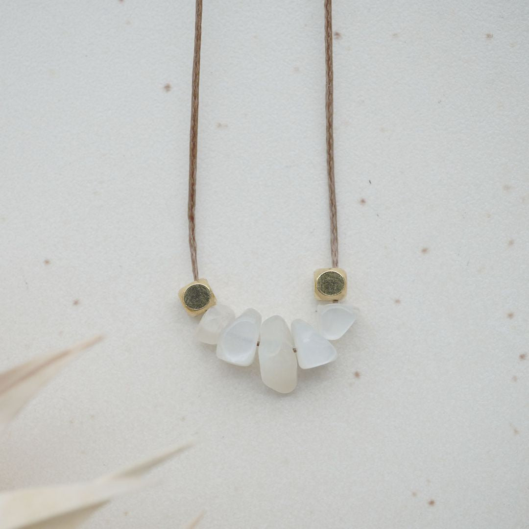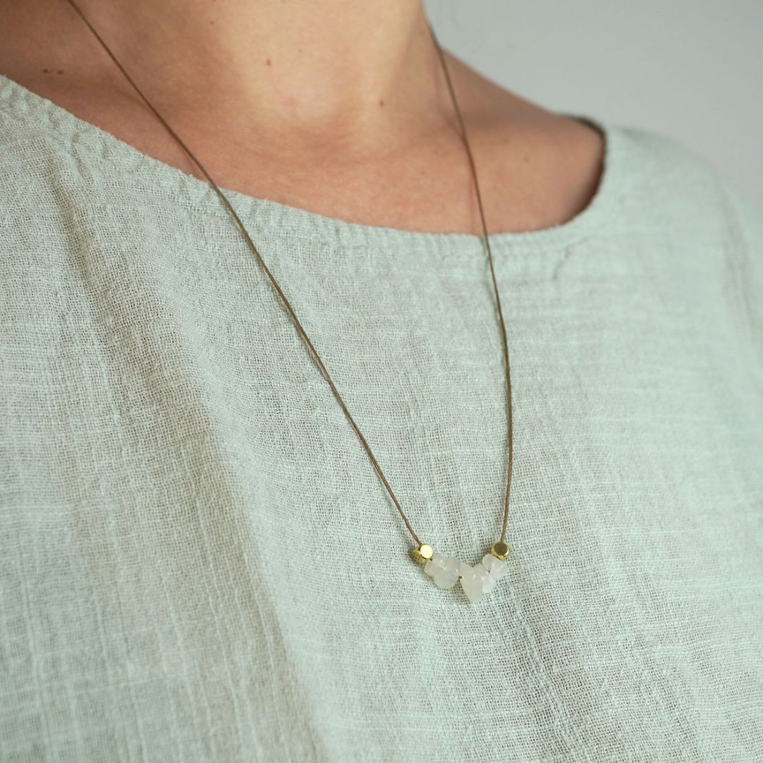 Feine Mondsteine und Messing. Du kannst die Kette schön in der Länge anpassen (2-Knoten-Verschluss) und somit toll mit verschiedenen Styles & anderen Ketten kombinieren. Kette: syntethische Kordel Anhänger: Mondsteine, Messing