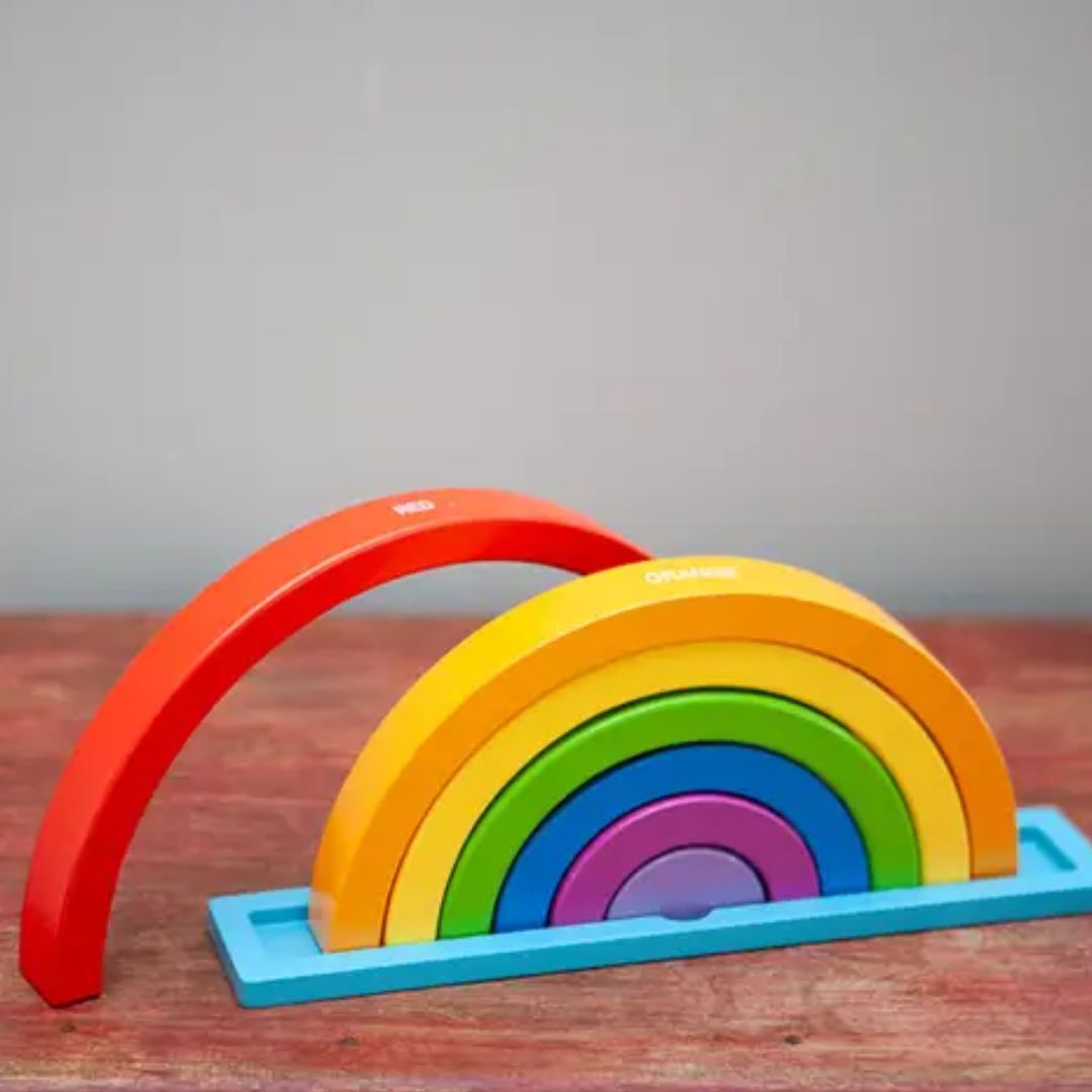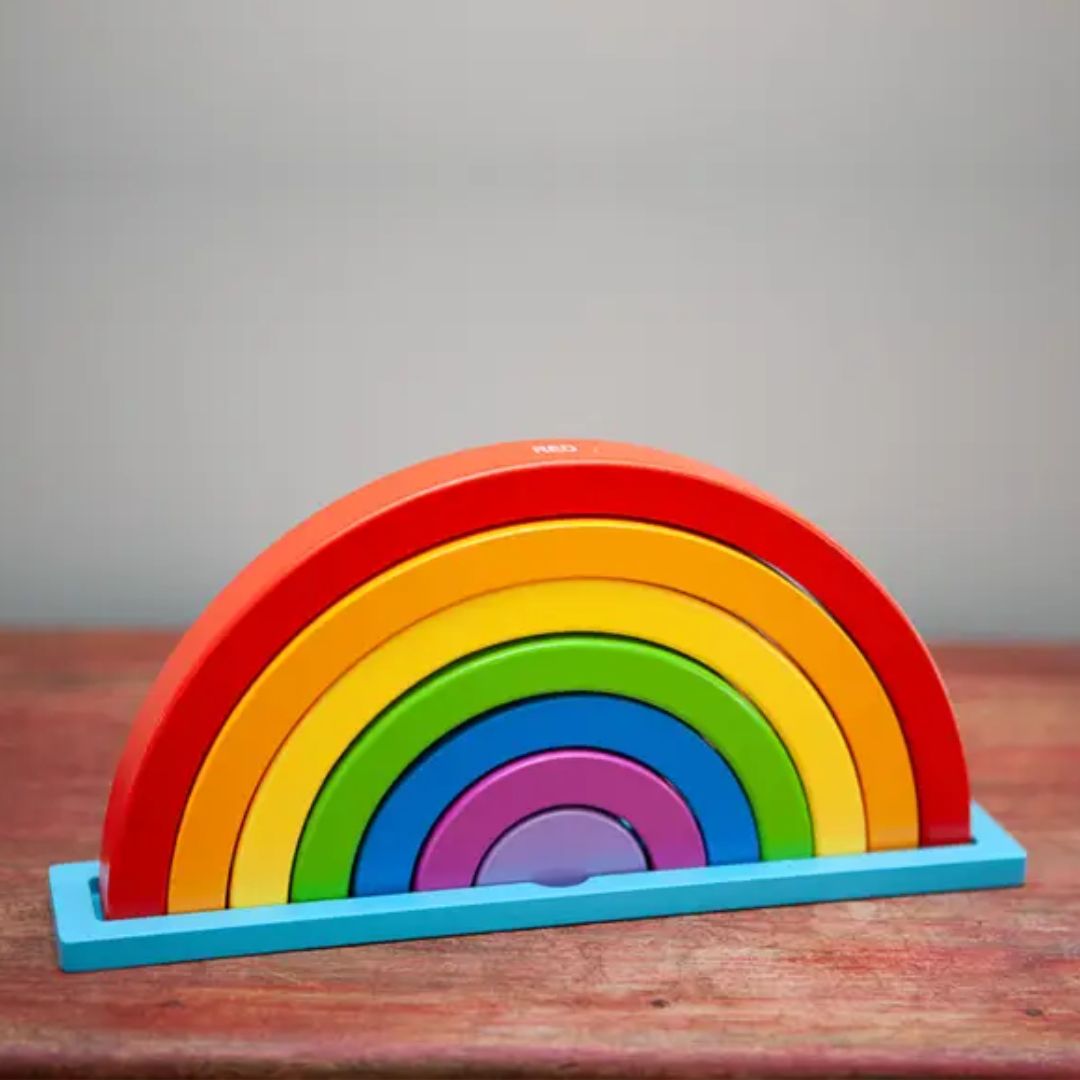 Das Regenbogen-Spiel ist ein sehr vielseitiges Spielzeug und schon für Krabbelkinder wunderbar zum Spielen geeignet! Die Kleinen stapeln, bauen und sortieren.