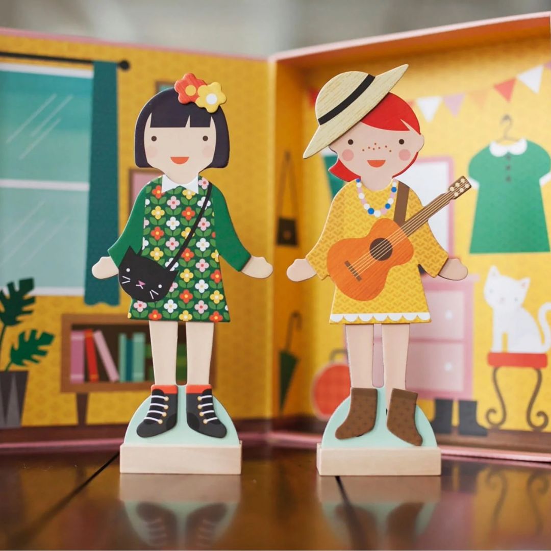 Hilf diesen besten Freundinnen, sich für einen Tag voller Spaß vorzubereiten. Wähle ihre Outfits und Accessoires mit diesem modischen Magnetpuppen-Anziehset.