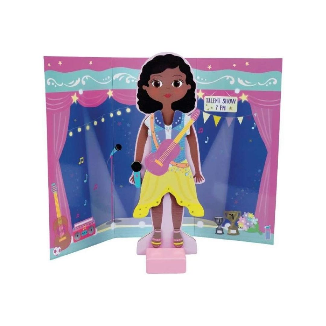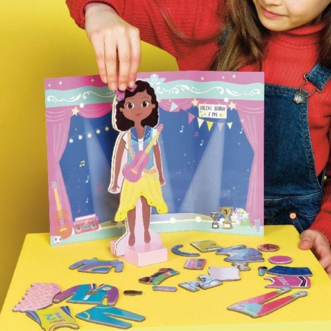 In der wiederverwendbaren Geschenkbox finden sich 40 magnetische Teile, die sich leicht an Zoey befestigen und wieder abnehmen lassen. Diese Teile umfassen verschiedene Kleidungsstücke und Accessoires, die es den Kindern ermöglichen, Zoey in einer Vielzahl von Outfits zu kleiden.