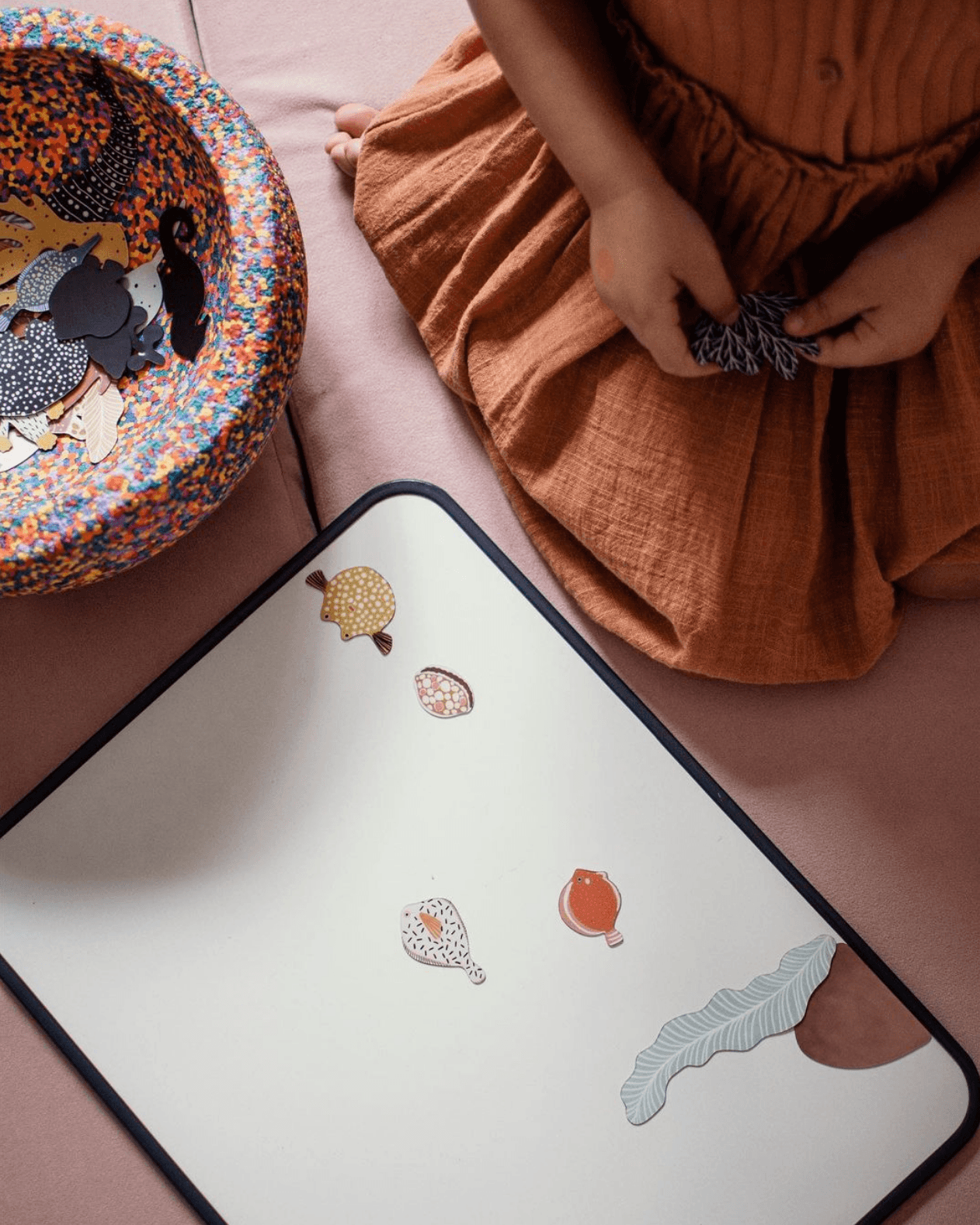 Magnetisches Spiel mit Meerestieren „Tauchen Sie ein in das Herz des Ozeans, um all seine Bewohner zu entdecken!“ Description • 43 Weichmagnete (2 vorgeschnittene A4-Magnetfolien) (Die Formen müssen vorsichtig vom Träger gelöst werden). • 1 Abbildung auf der Rückseite der Verpackung Alter: 3 bis 9 Jahre Zusammensetzung: wasserdichtes, weichmagnetisches Material Die Magnete können mit Wasser und Seife gereinigt werden. Die Überlagerung der Magnete bietet Kindern die Möglichkeit, ihr eigenes Spielerlebnis zu gestalten und sich eine Vielzahl von Geschichten vorzustellen. Erweitere deine Erlebnisse und Geschichten, indem du mit Magneten im Wasser spielst! Durch Benetzen der Magnete haften sie auf Glas-, Fliesen- und Kunststoffoberflächen (Harz). Unsere Produkte erfüllen die Anforderungen der EG-Spielzeugsicherheitsnorm EN 71, aber auch der REACH-Verordnung. Mit Liebe in Frankreich hergestellt.