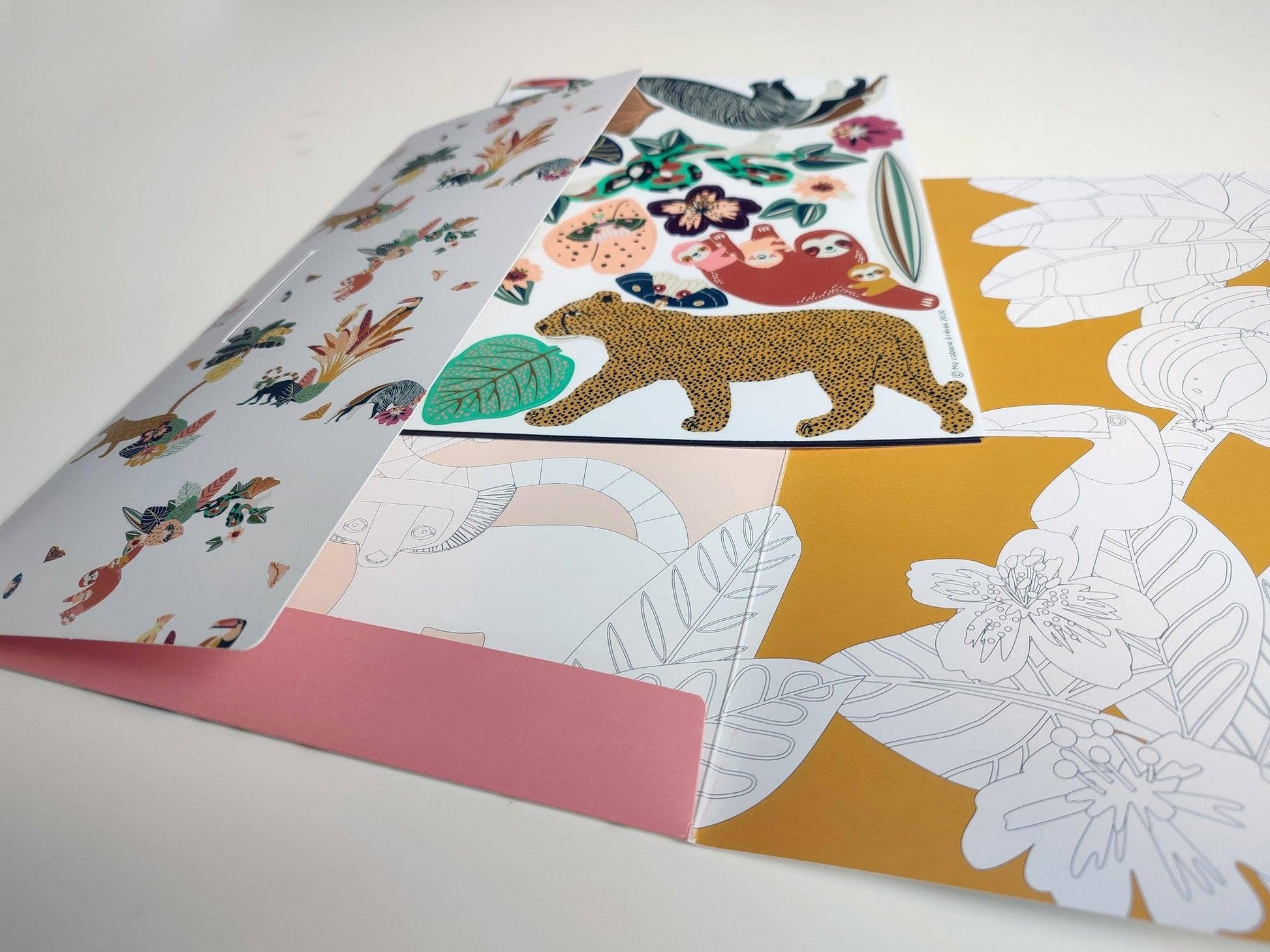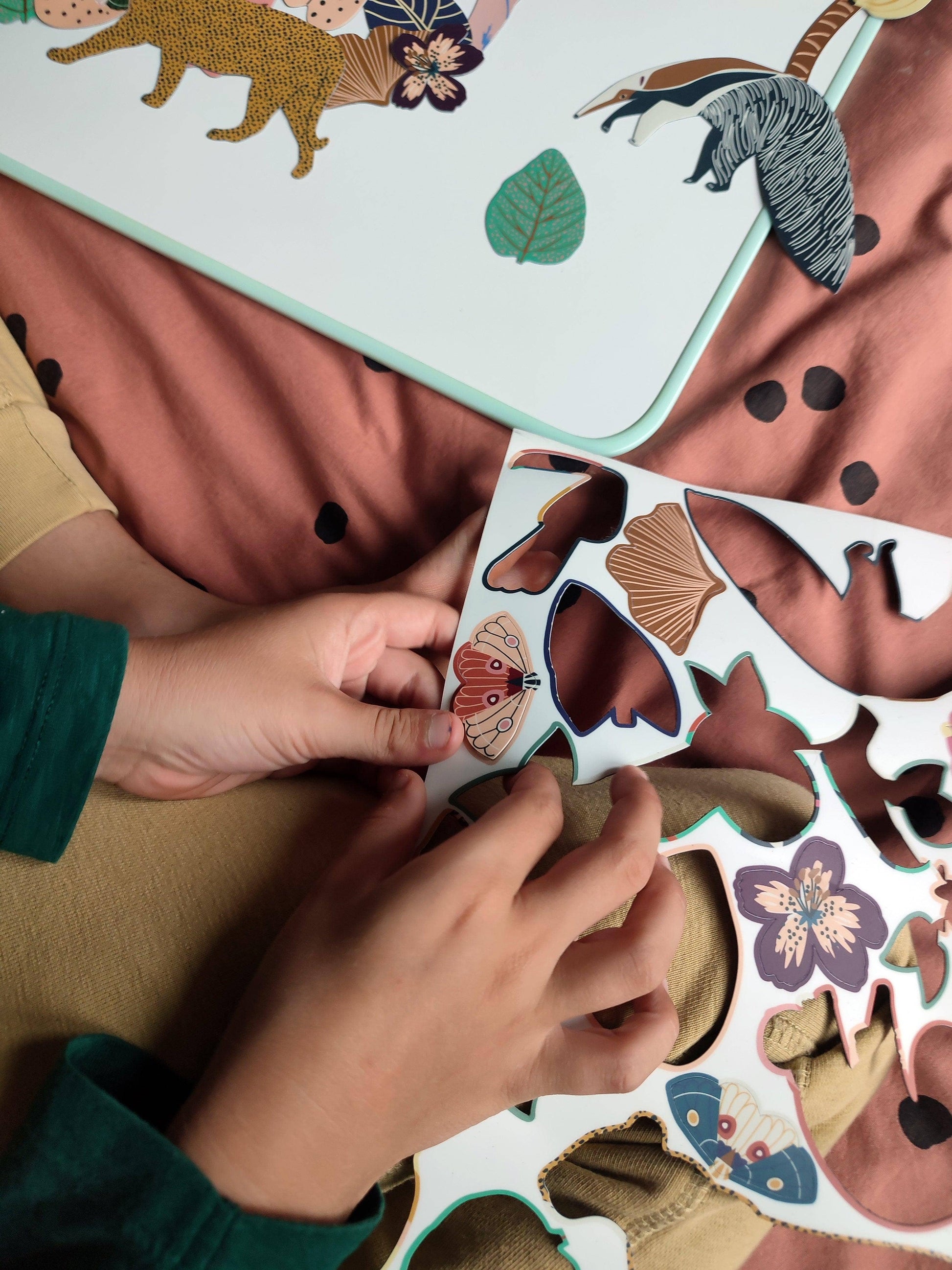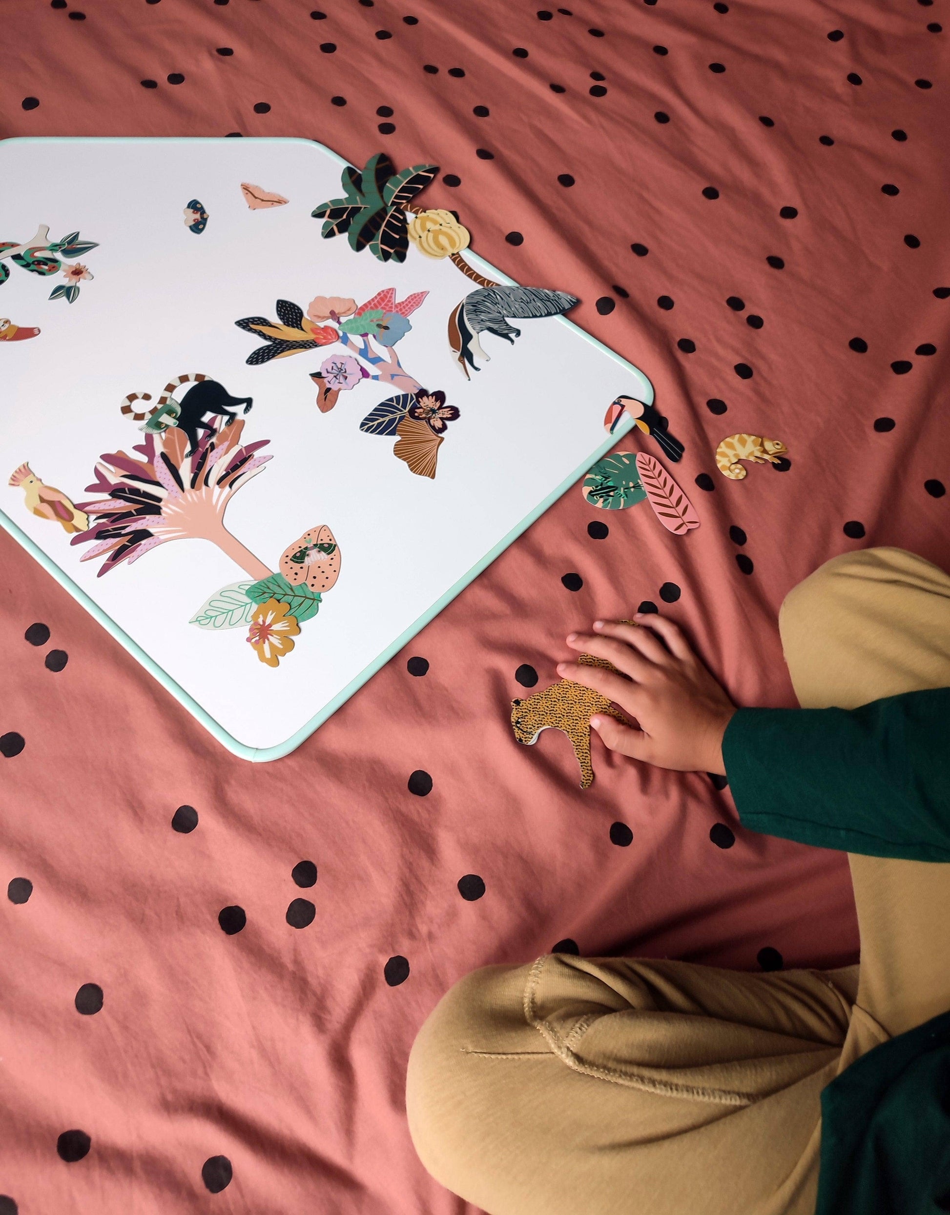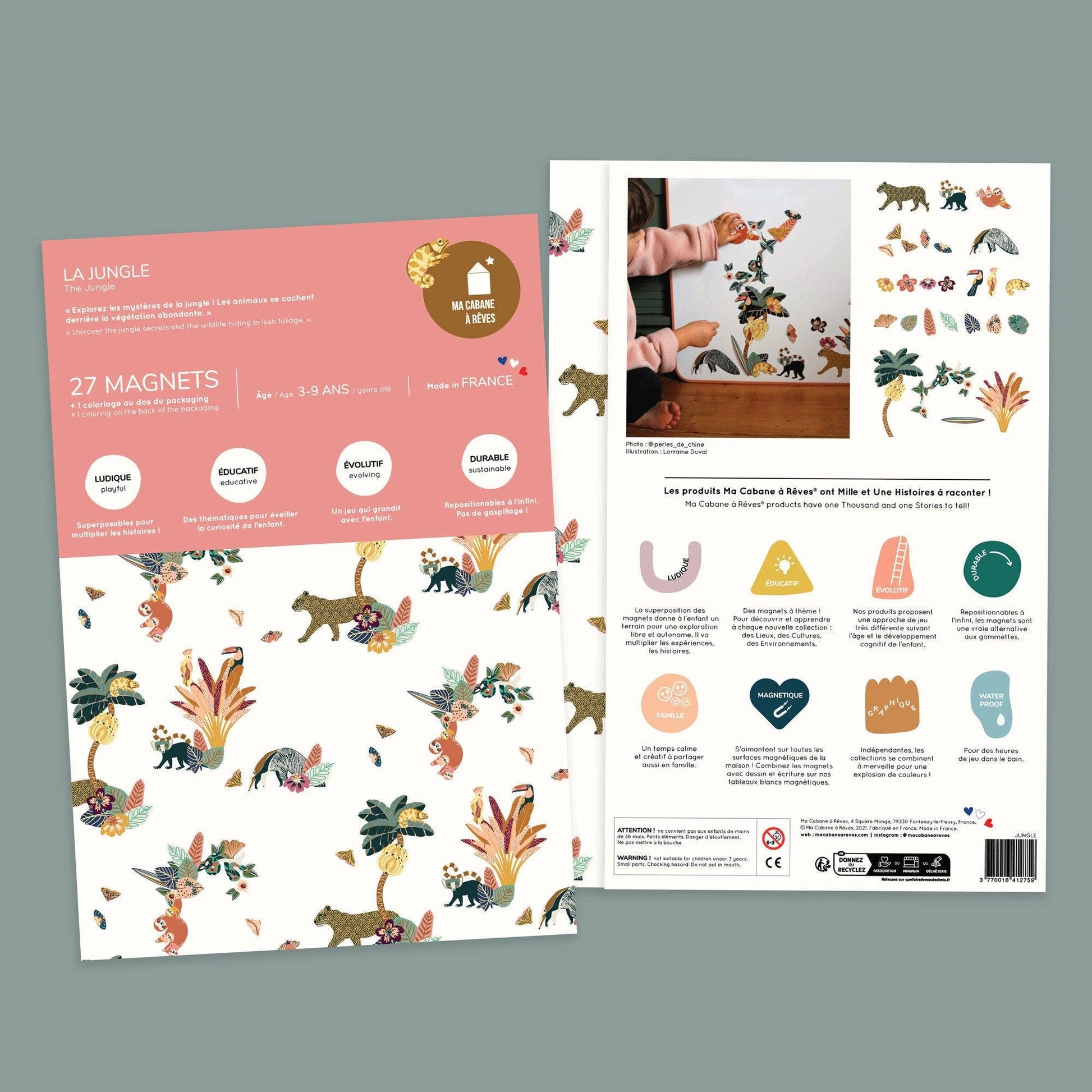 Magnetspiel Jungle Animal „Erkunde die Geheimnisse des Dschungels! Die Tiere verstecken sich hinter der üppigen Vegetation.“ Beschreibung: • 27 Weichmagnete (2 vorgeschnittene A4-Magnetfolien) Die Formen sind vorsichtig vom Träger zu lösen). • 1 Malvorlage auf der Rückseite der Verpackung Alter: 3 bis 9 Jahre Zusammensetzung: wasserdichtes, weichmagnetisches Material Die Magnete können mit Wasser und Seife gereinigt werden. Die Überlagerung der Magnete bietet Kindern die Möglichkeit, ihr eigenes Spielerlebnis zu gestalten und sich eine Vielzahl von Geschichten vorzustellen. Erweitere deine Erlebnisse und Geschichten, indem du mit Magneten im Wasser spielst! Durch Benetzen der Magnete haften sie auf Glas-, Fliesen- und Kunststoffoberflächen (Harz) auch auf Badewannenrändern. Unsere Produkte erfüllen die Anforderungen der EG-Spielzeugsicherheitsnorm EN 71, aber auch der REACH-Verordnung. Mit Liebe in Frankreich hergestellt.