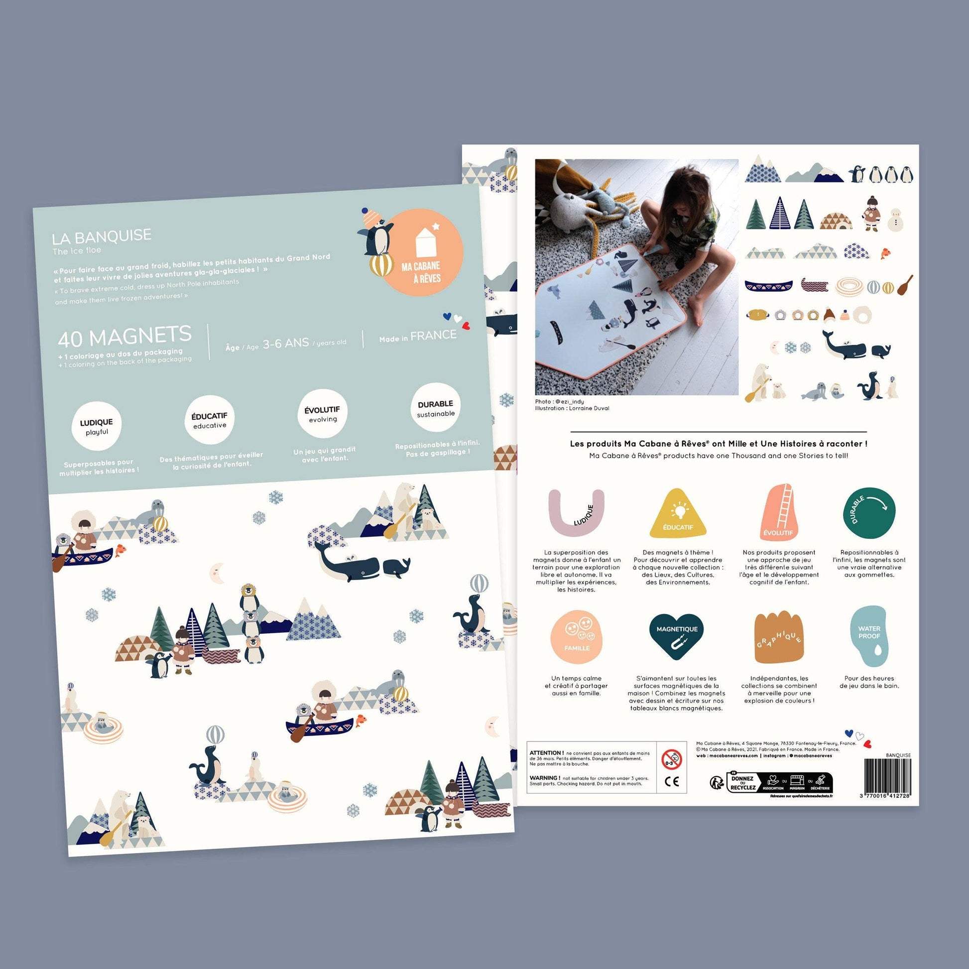 Magnetspiel Tiere auf der Eisscholle „Um der eisigen Kälte zu trotzen, kleide die kleinen Bewohner des hohen Nordens an und lasse sie spannende, glitzernd-vereiste Abenteuer erleben!“ • 40 weiche Magnete (2 vorgestanzte A4-Magnetbögen). Die Formen sind vorsichtig vom Träger zu lösen. • 1 Ausmalbild auf der Rückseite der Verpackung Alter: 3 bis 6 Jahre Material: wasserfestes, weiches Magnetmaterial. Die Magnete können mit Seife und Wasser gereinigt werden. Das Übereinanderlegen der Magnete ermöglicht es Kindern, ihr eigenes Spiel zu gestalten und viele Geschichten zu erfinden. Erweitere das Spielerlebnis, indem du mit den Magneten im Wasser spielst! Durch Anfeuchten haften sie an Glas, Fliesen und Kunststoff (Harz) Oberflächen. Unsere Produkte erfüllen die Anforderungen der europäischen Spielzeugsicherheitsnorm EN 71 sowie der REACH-Verordnung. Mit Liebe in Frankreich hergestellt.