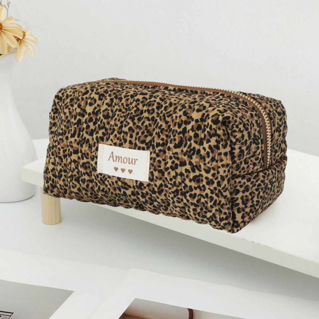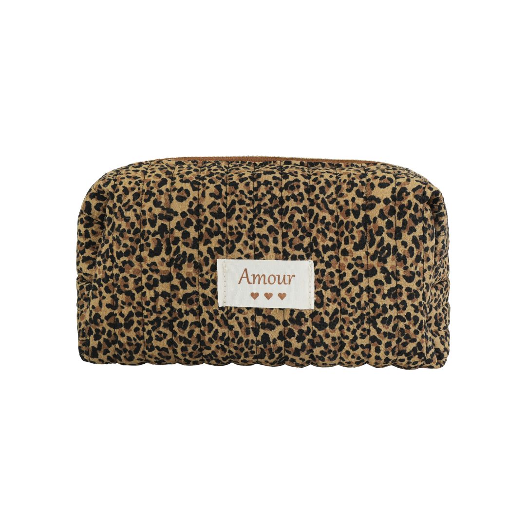 Die Make-up Tasche mit dunklem Leo-Muster und der eleganten Stickerei 'Amour' ist das perfekte Accessoire für alle, die Funktionalität und Stil vereinen möchten. Sie bietet genug Platz für deine Essentials, ist leicht, vielseitig einsetzbar und ein echter Hingucker.