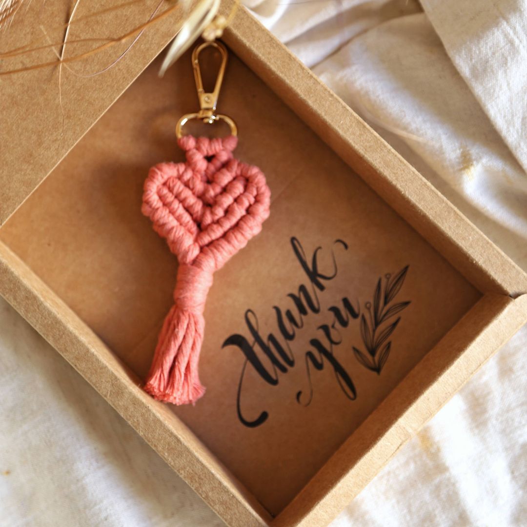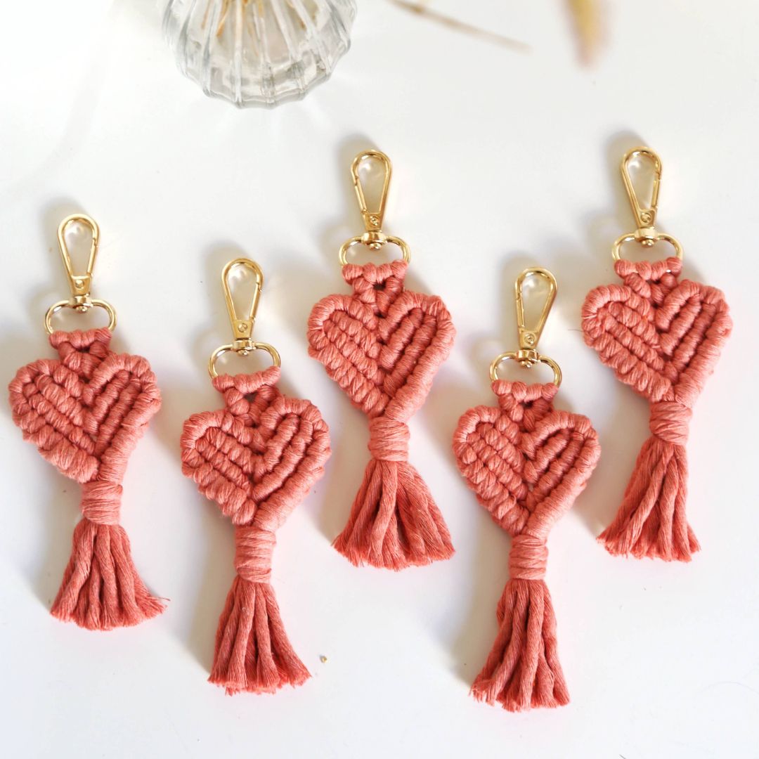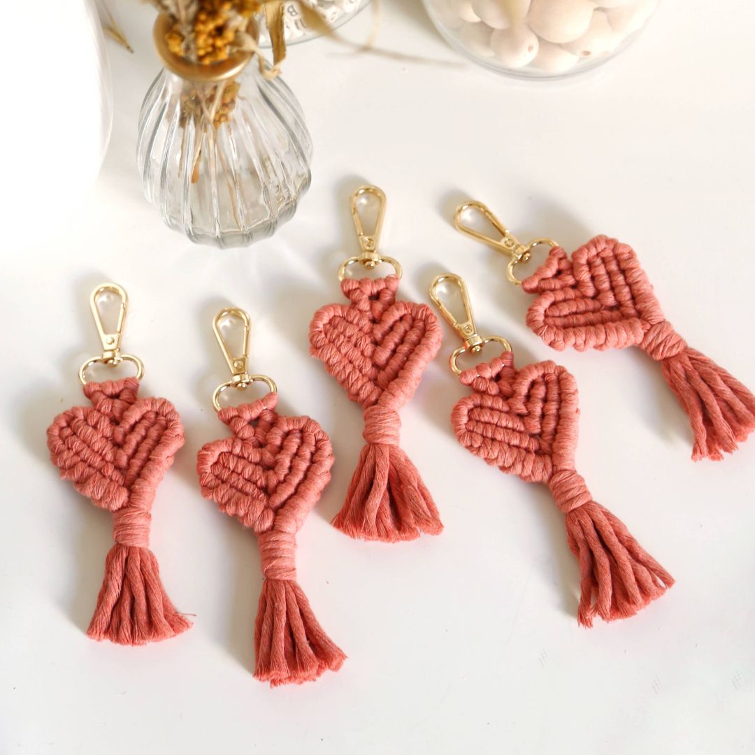 Herzförmige Makramee-Schlüsselanhänger zum Valentinstag, zum Muttertag oder einfach als ein süßes Geschenk! Dieser schicke Makramee-Herz-Schlüsselanhänger besteht aus 100% natürlicher Baumwoll-Makramee-Schnur. Jedes Stück misst ca. 16 cm