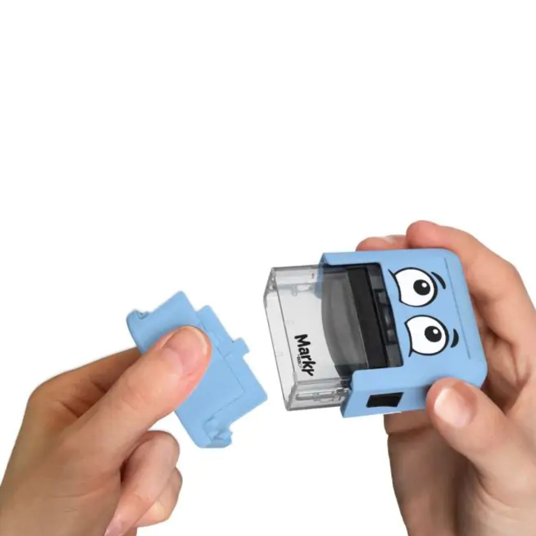 - Marky Stempel mit blauem Gehäuse: Ergonomisch und stylisch.