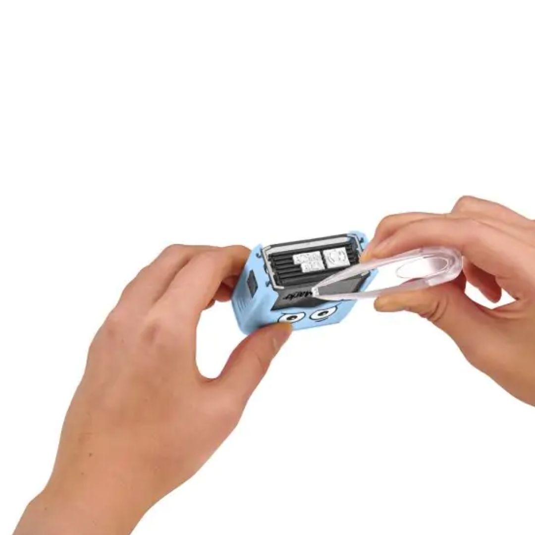 Mach Schluss mit verlorenen Dingen und setze auf Ordnung mit Stil! Marky, dein blauer Markierungsstempel, ist bereit, dir das Leben zu erleichtern.