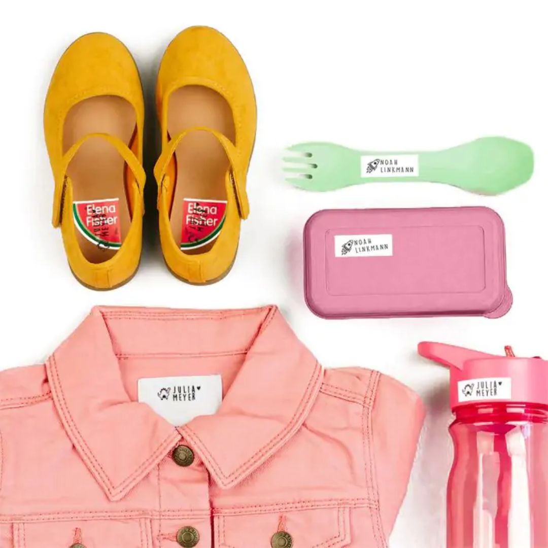 - Für nicht stempelbare Oberflächen, wie Trinkflaschen oder Brotdosen, klebe die robusten Etiketten auf.