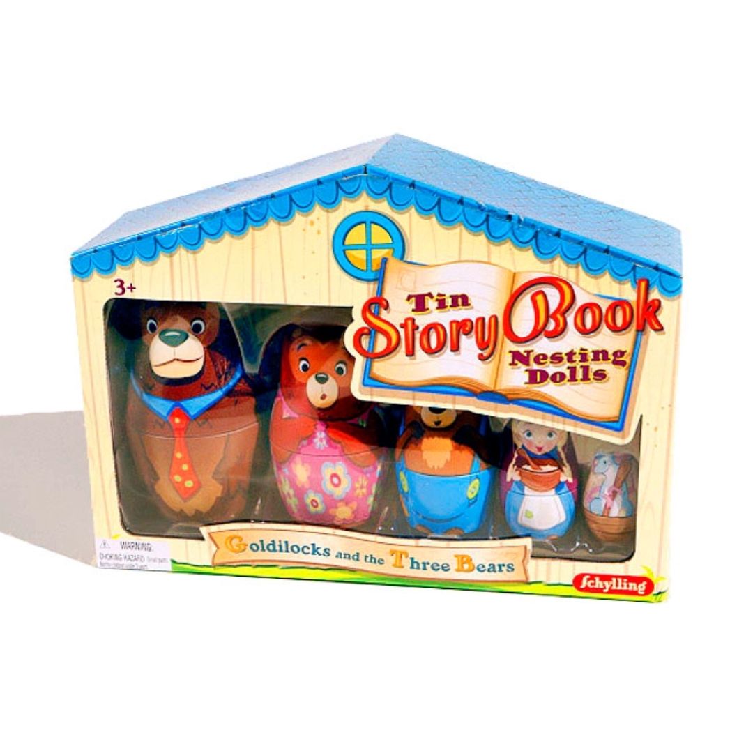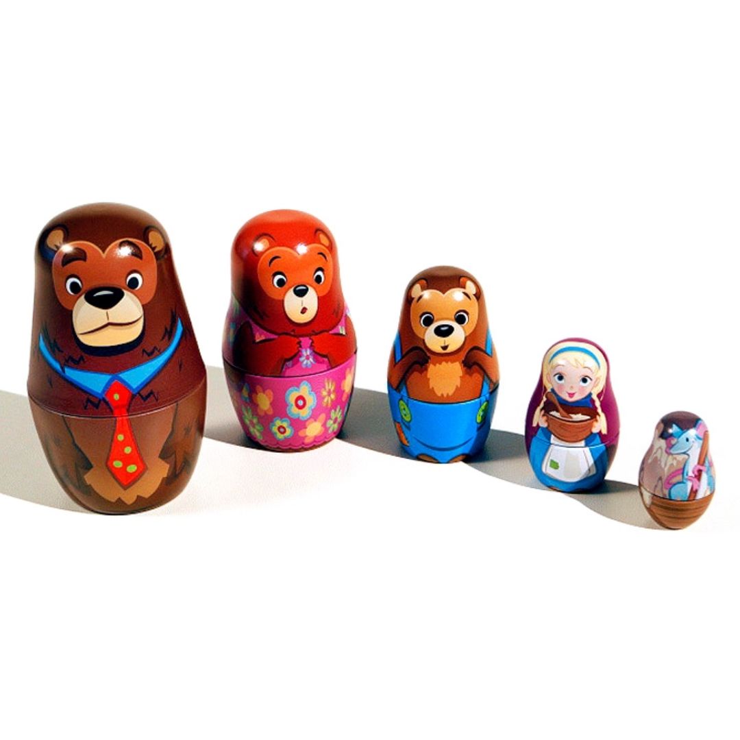 Matrjoschka Goldlöcken und die drei Bären. Das Auseinandernehmen und wieder Zusammenstecken, das Ineinanderstecken ist ein großer Spielspaß. Ein wunderschönes Matrjoschka Ensemble bestehend aus 5 Figuren. Die größte Figur ist 11 cm groß.