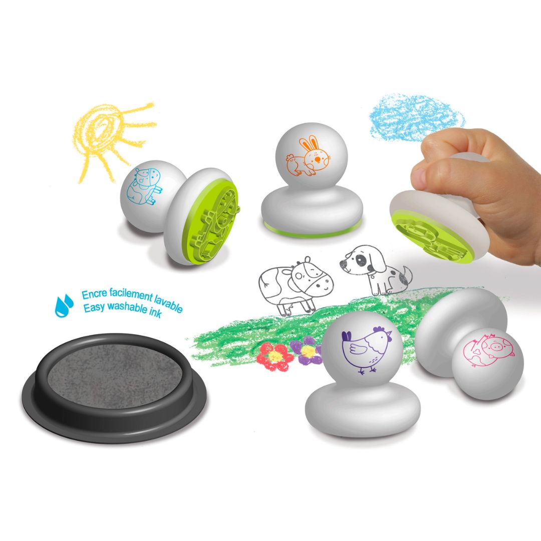 Mit fünf weichen Schaumstoffstempeln und einem großen, grauen Stempelkissen ist alles dabei, was kleine Künstler brauchen, um erste Stempelabdrücke zu machen. Die kindgerechten Bauernhoftiere – Hase, Kuh, Henne, Hund und Schwein – laden zum Wiedererkennen, Nachahmen und fantasievollen Spielen ein.