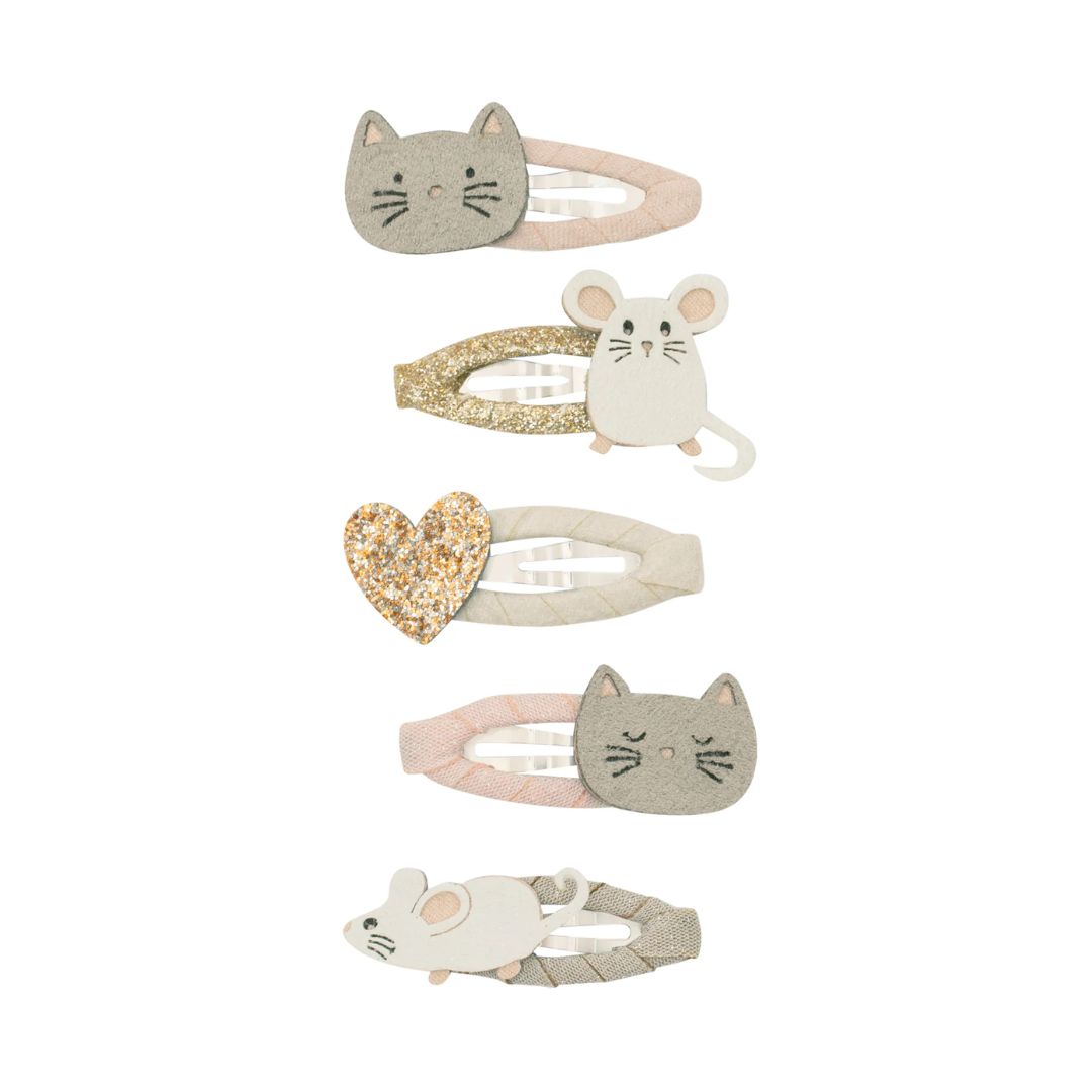 Begrüße unsere supersüßen Mini-Clips mit Katzen und Mäusen! Zwei weiche kleine Katzengesichter, zwei süße kleine Mäuse und ein golden glitzerndes Herz – kombiniere   sie zu allen möglichen bezaubernden Styles!