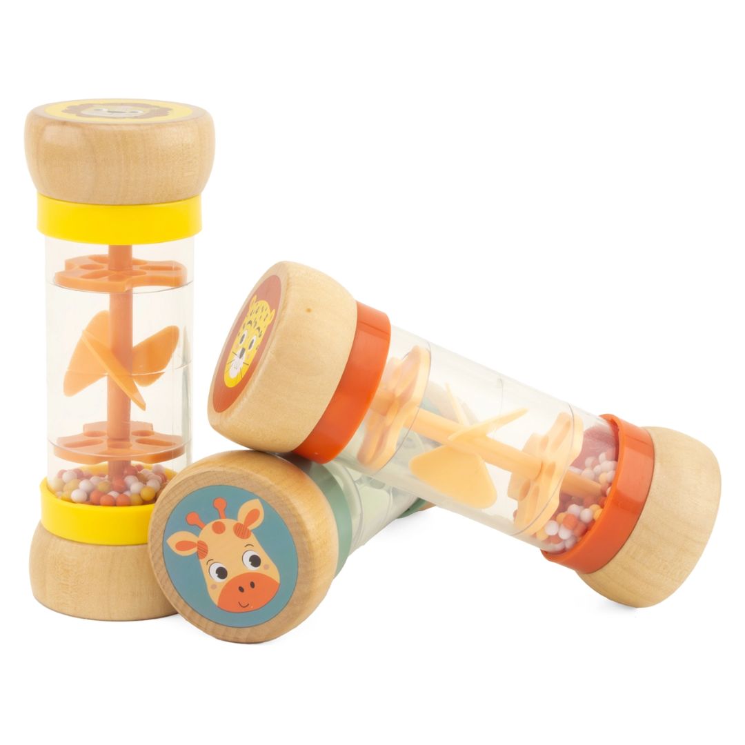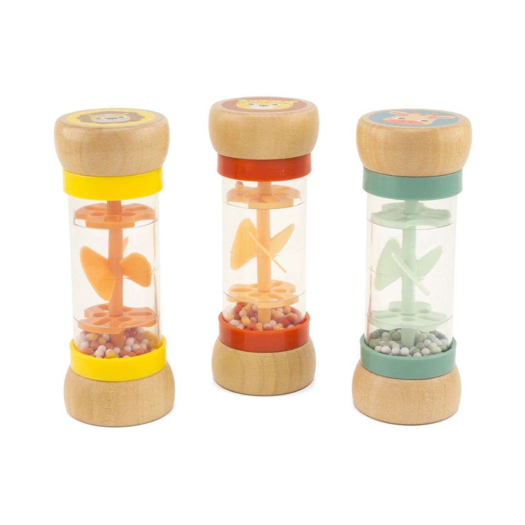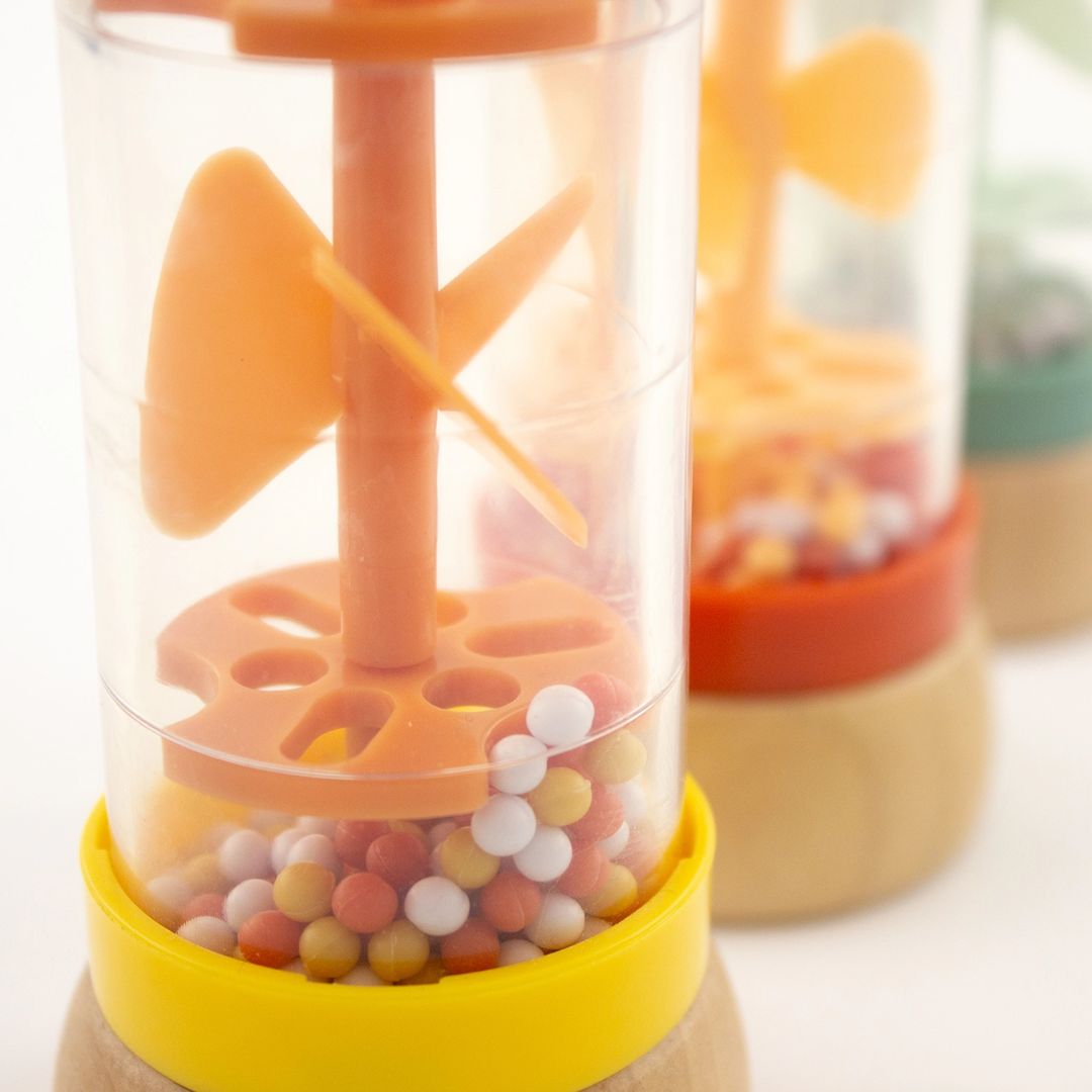 Der Mini-Regenstab wurde entwickelt, um spielerisch Sinne zu fördern, visuelle Faszination zu erzeugen und durch die Kombination aus Bewegung, Klang und Farbe eine beruhigende Wirkung zu entfalten. Die kleinen Kugeln im Inneren durchqueren mehrere perforierte Ebenen und bringen beim Umdrehen einen kleinen Propeller in Bewegung. Dabei verändert sich die Drehrichtung mit jeder Wendung – ein hypnotischer Effekt, der nicht nur für Kinder, sondern auch für Erwachsene wohltuend und meditativ wirken kann.