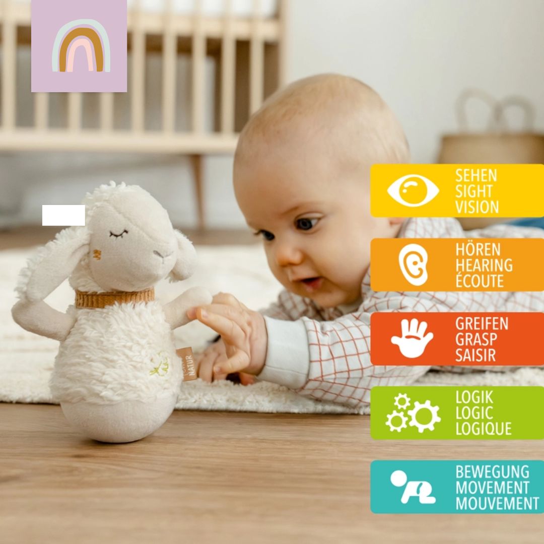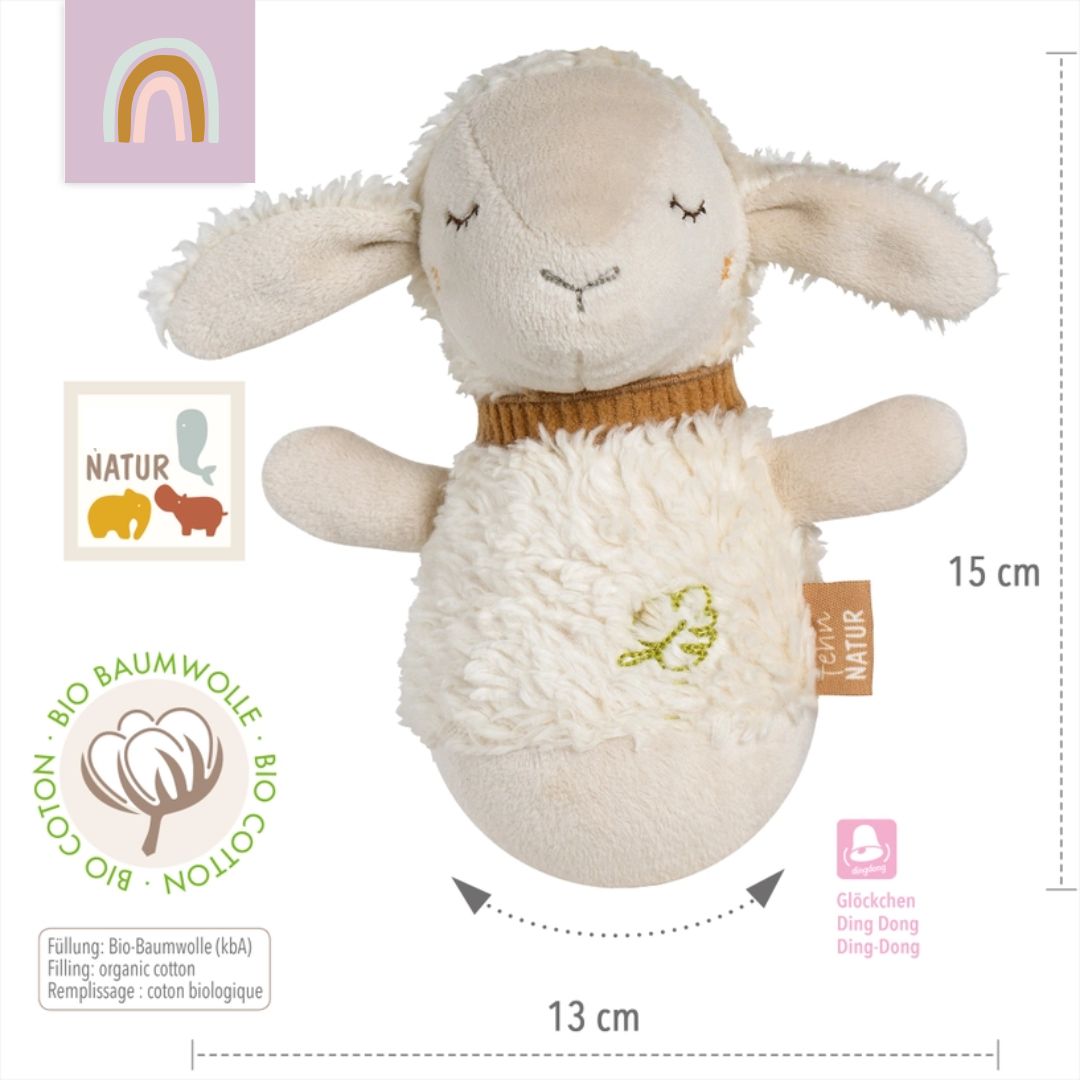 Mit dem kleinen Stehauf-Schaf wird das Baby in eine niedliche Tierwelt eintauchen und spielerisch neue Dinge entdecken: Wird das Spielzeug angestupst, wippt und kreiselt es lustig auf der Stelle oder kullert ein kleines Stück weiter. Mit dem Glöckchen und dem weichen Obermaterial des Stehaufmännchens aus Bio-Baumwolle aus kontrolliert biologischem Anbau (kbA), wird eine Vielzahl an Greif-, Tast-, und Spielmöglichkeiten geboten und die Aufmerksamkeit des Babys gefördert. Ob Zuhause oder unterwegs, das praktische Spielzeug ist überall einsetzbar und wird so schnell zu Babys treuem Begleiter! Größe: 15 Farbe : Ecru ab 0+ Monaten CE Label Waschbarkeit : Schonende Handwäsche Obermaterial Plüsch, Nicki, Cord: Bio-Baumwolle / Füllung: Bio-Baumwolle Baumwolle Glöckchen